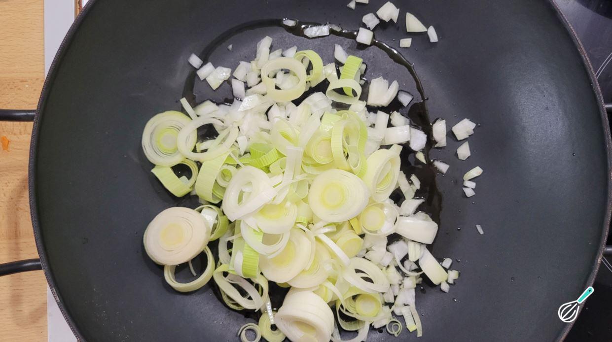 Em uma frigideira com um fio de azeite, acrescente a cebola e o alho-poró e deixe dourar.