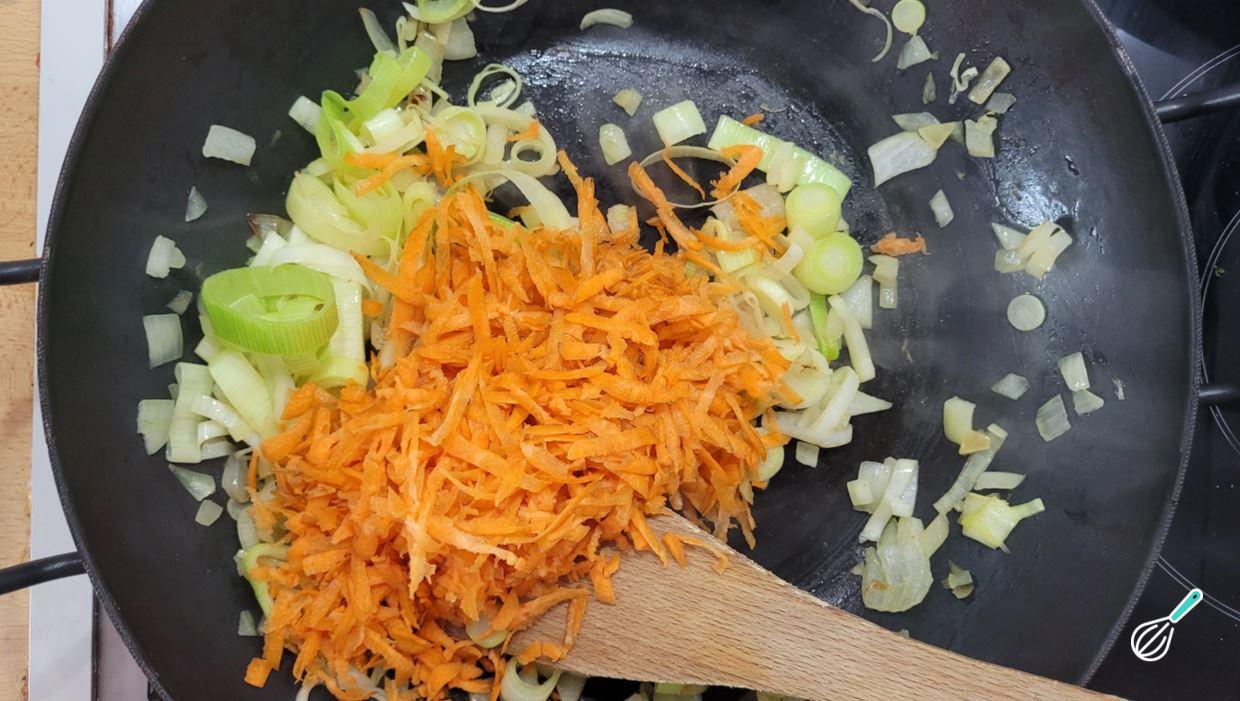 Quando estiverem bem translúcidos, adicione a cenoura e deixe refogar uns 2 minutos.