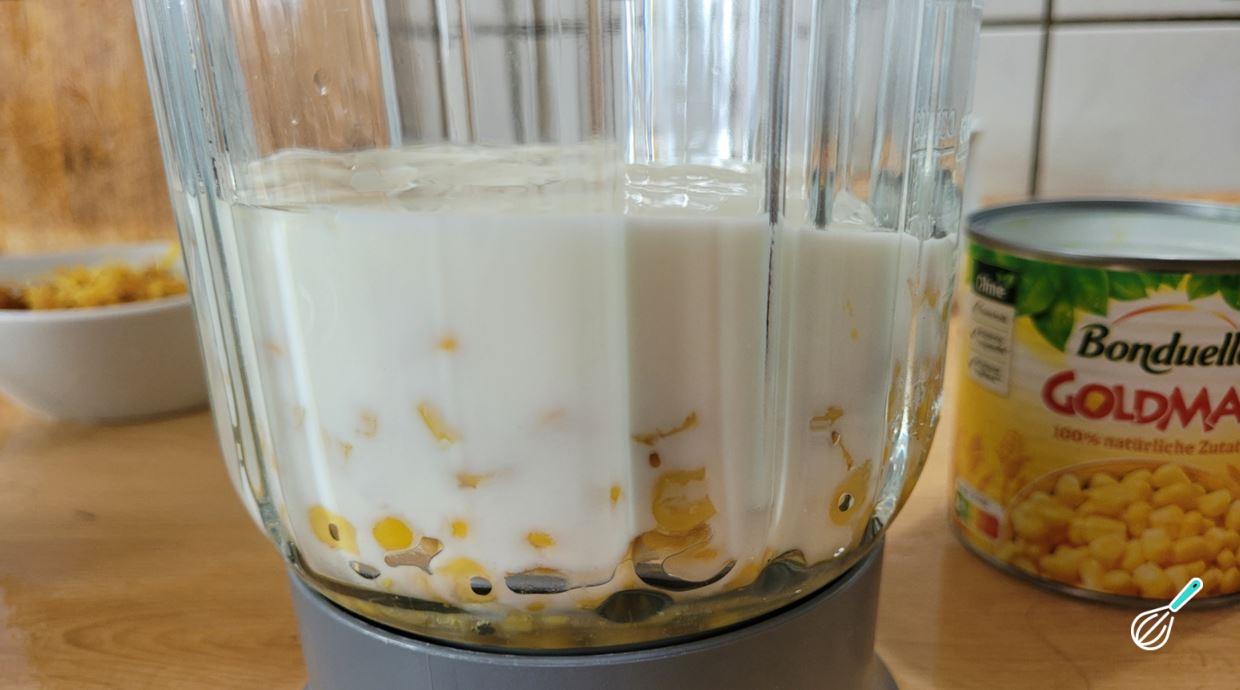 Enquanto isso, faça a base da massa. Escorra o milho e coloque no liquidificador junto com o requeijão.