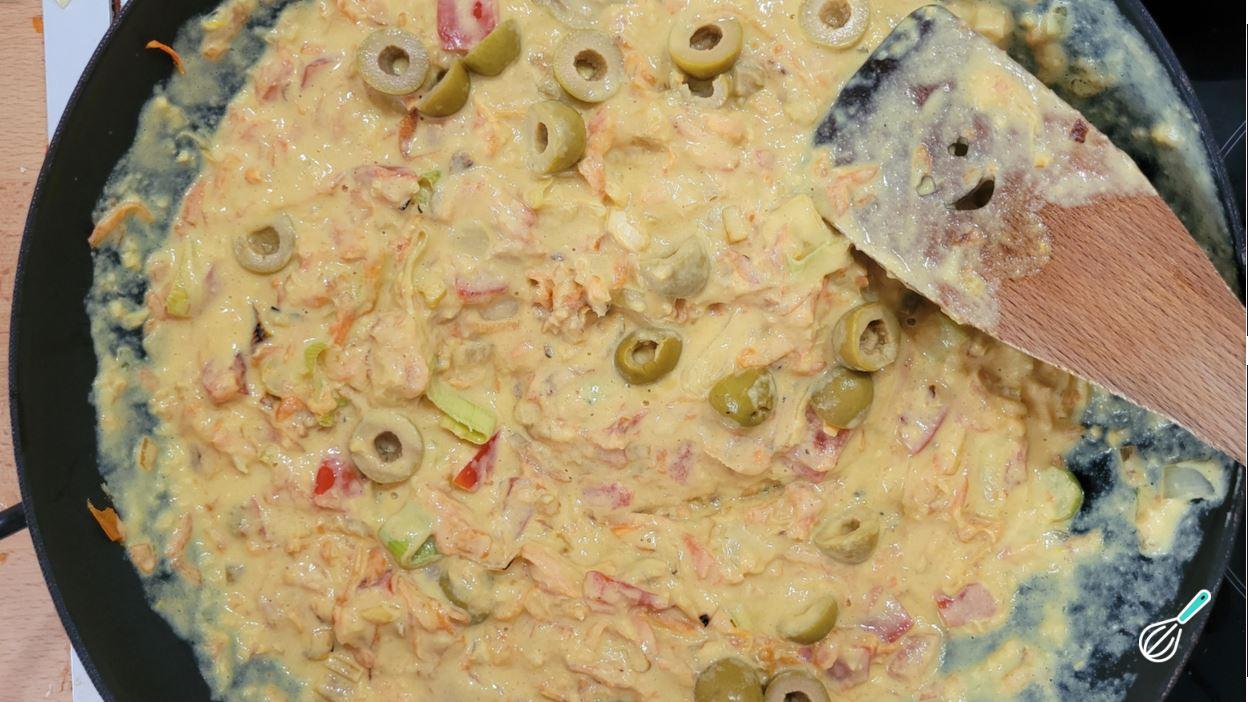 Quando a mistura tiver engrossado, acrescente as azeitonas.