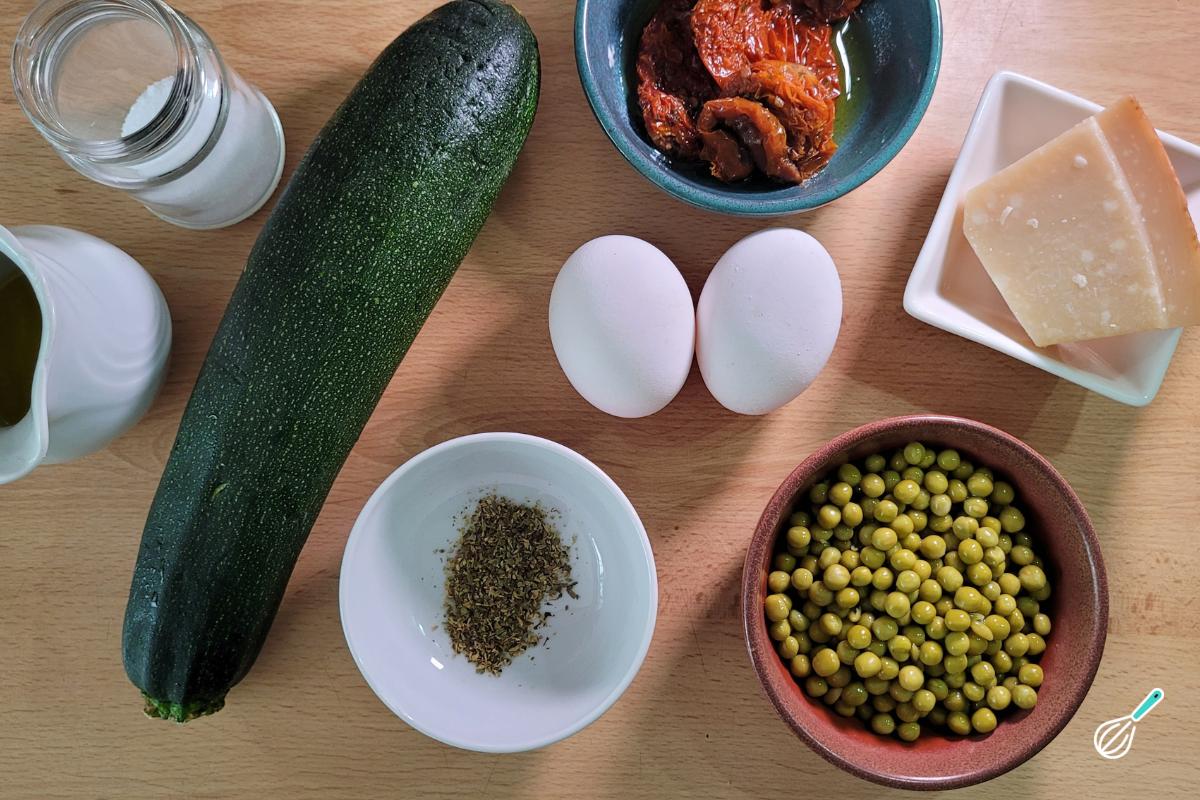 Separe os ingredientes para você fazer a sua fritada de abobrinha. Você pode usar os temperos que quiser e também pode aproveitar para colocar outros vegetais que tenha na geladeira, como cenoura, tomate, pimentão, milho em lata etc. e também usar proteínas como frango desfiado, atum em lata...