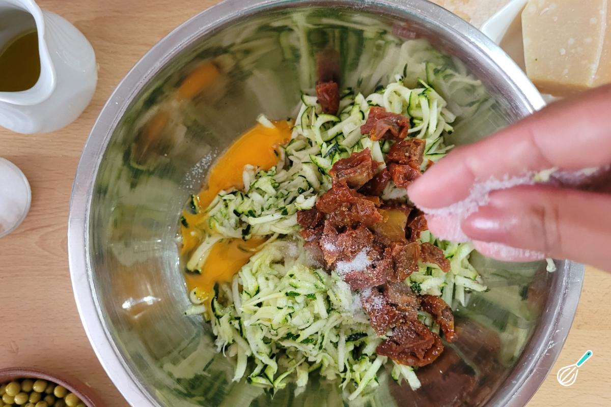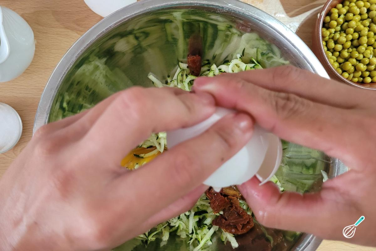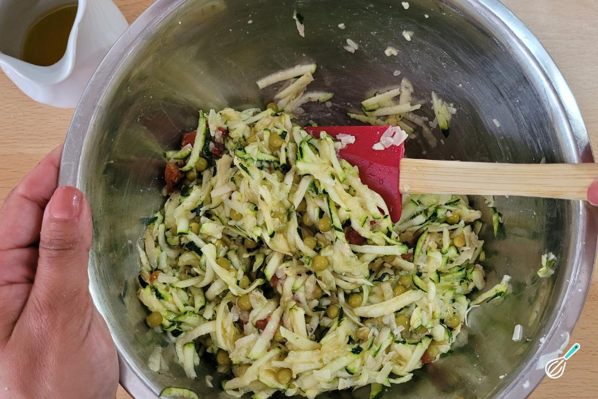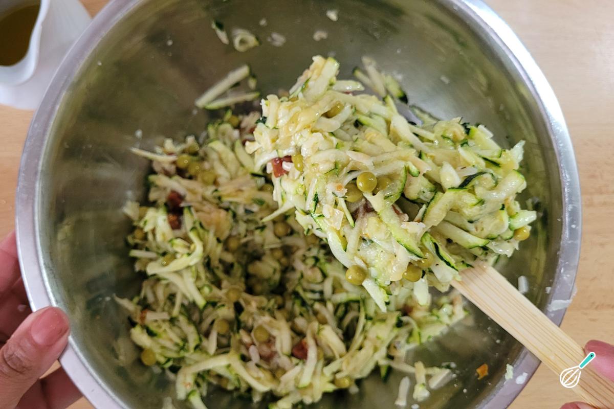 A massa não deve ficar muito líquida, mas precisa ter uma liga. Como a abobrinha solta muita água, se não tiver espremido a abobrinha e se a sua abobrinha não for muito grande e for a primeira vez que faz a receita, teste com um ovo e veja a consistência antes de adicionar o segundo ovo. Caso observe que tem muita água no fundo da tigela separada do restante, vire a tigela com cuidado para não cair o conteúdo na pia e tire o excesso de água.