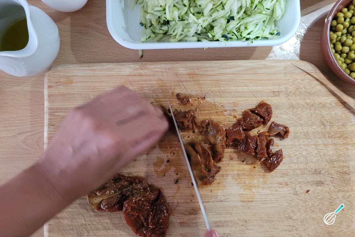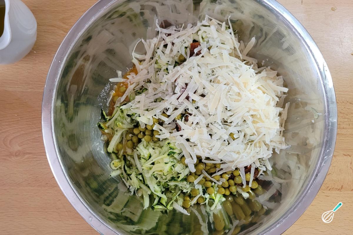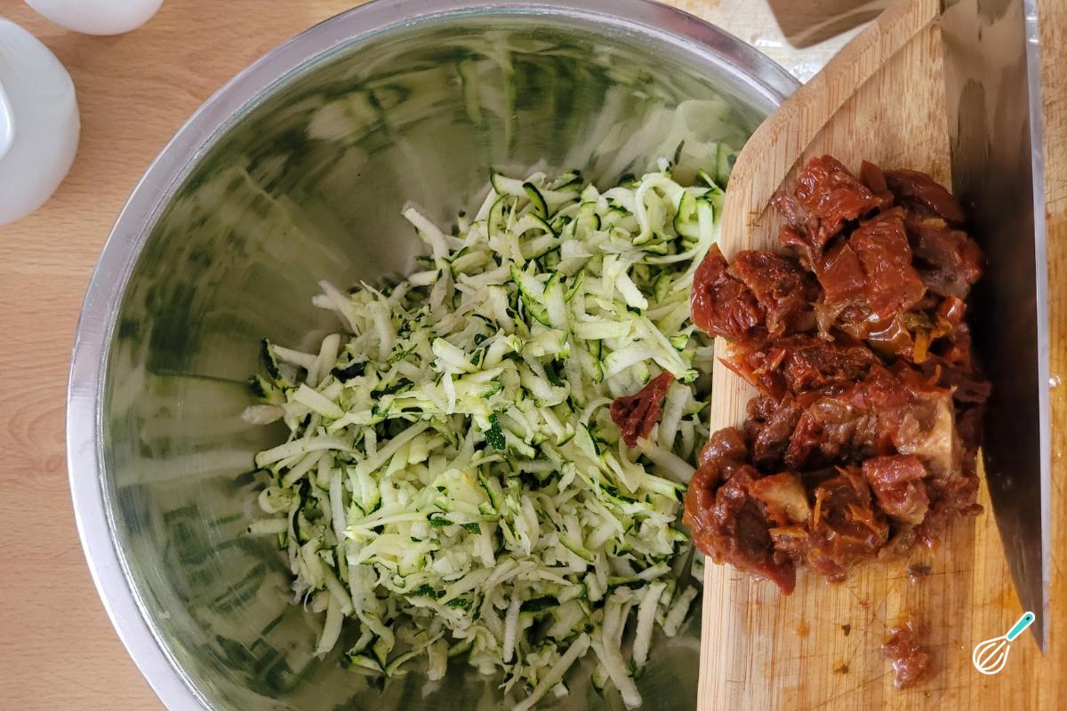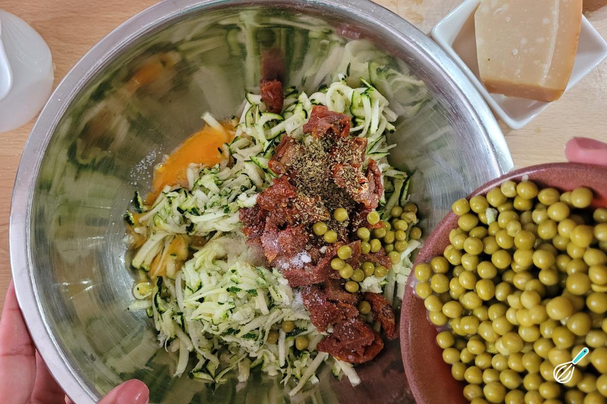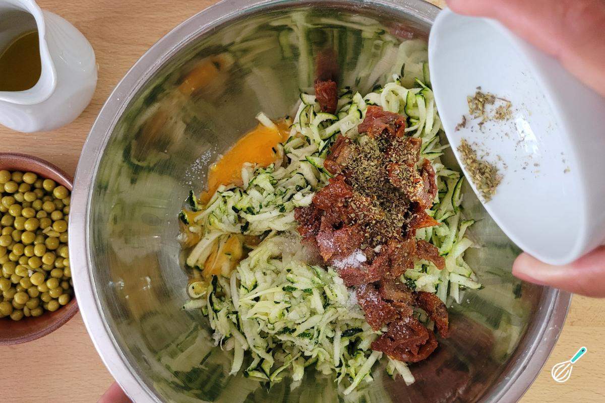 A massa não deve ficar muito líquida, mas precisa ter uma liga. Como a abobrinha solta muita água, se não tiver espremido a abobrinha e se a sua abobrinha não for muito grande e for a primeira vez que faz a receita, teste com um ovo e veja a consistência antes de adicionar o segundo ovo. Caso observe que tem muita água no fundo da tigela separada do restante, vire a tigela com cuidado para não cair o conteúdo na pia e tire o excesso de água.
