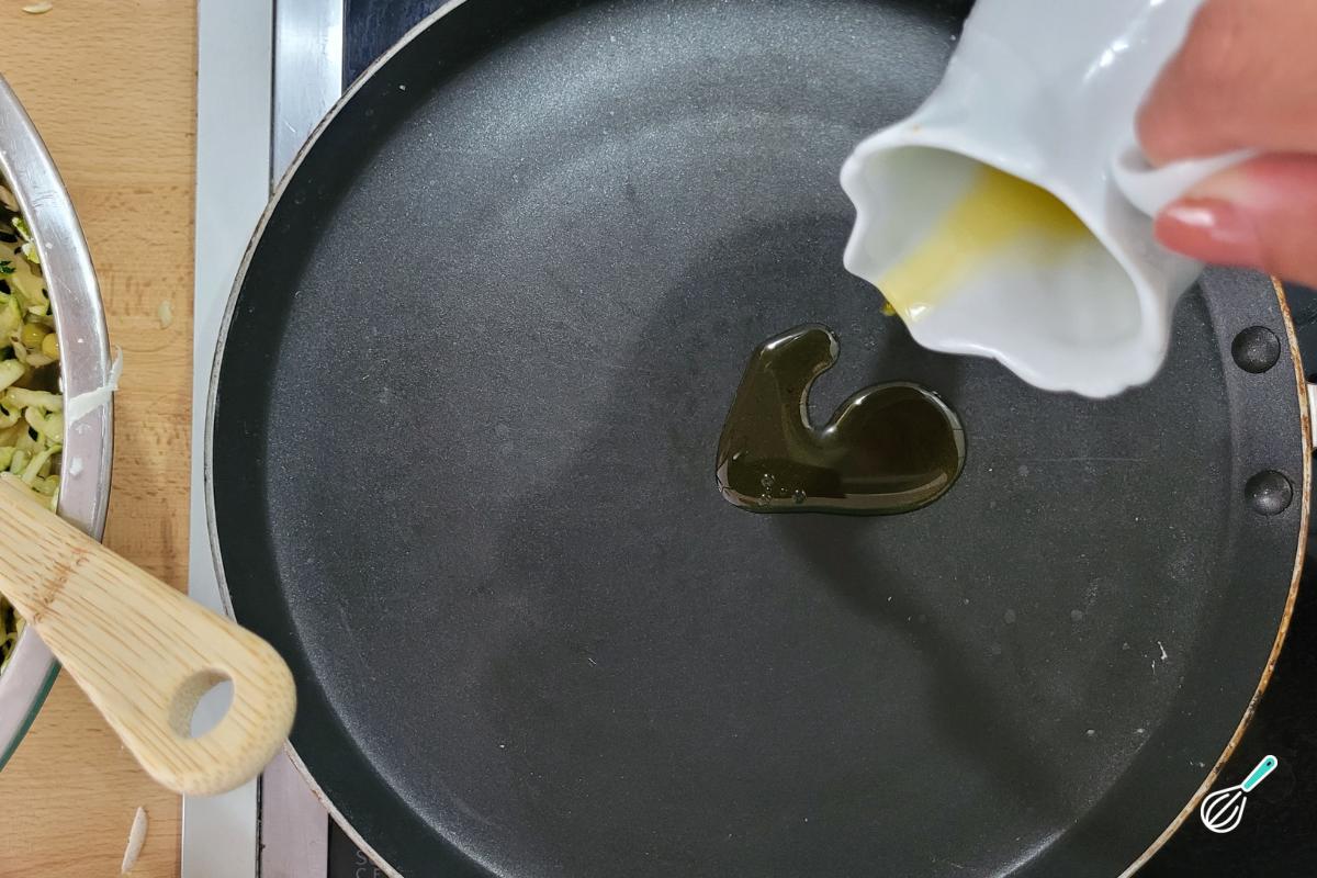 Em uma frigideira, de preferência antiaderente, coloque um pouco de azeite no fundo e espere esquentar. A frigideira antiaderente facilita na hora de virar e você não precisa usar tanta gordura, mas colocar um pouco de azeite ajuda a dourar.