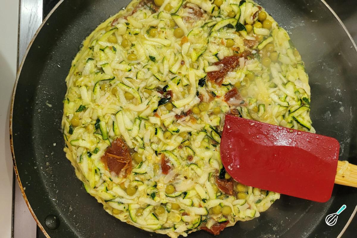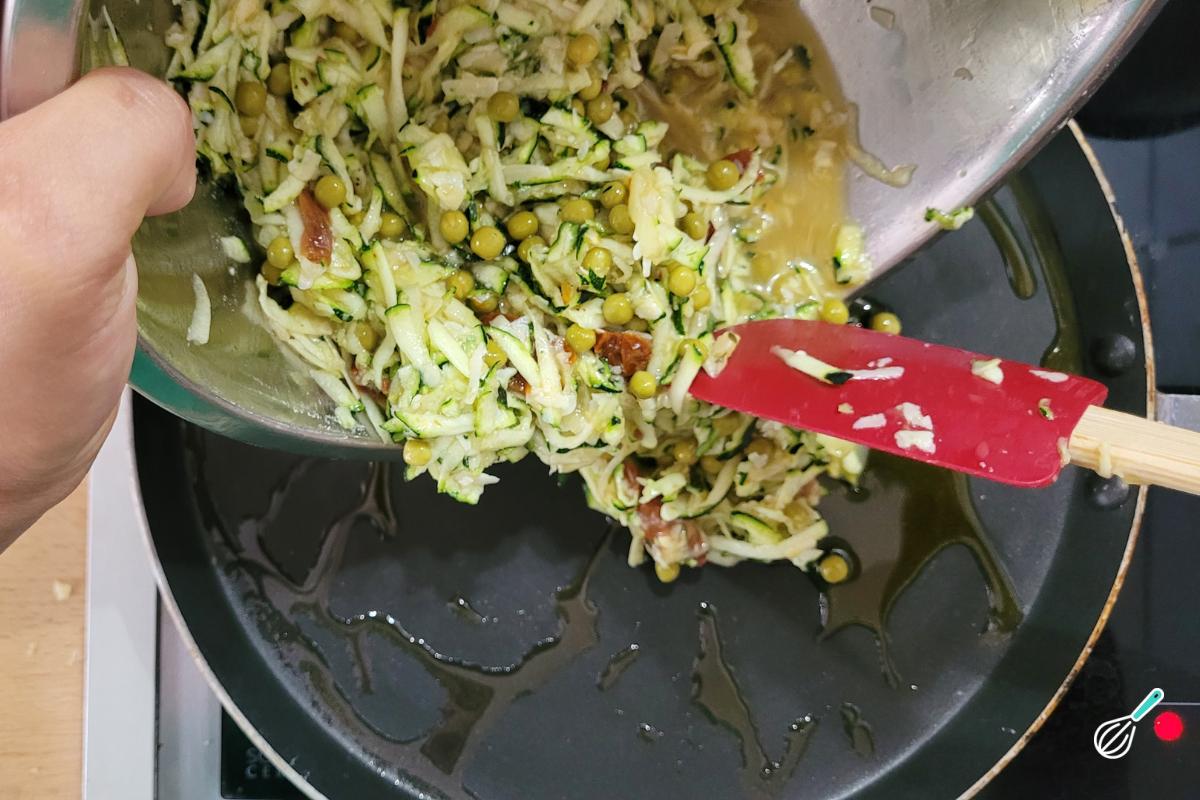 Coloque a massa na frigideira espalhando para que fique homogênea. Você pode fazer uma fritada maior ou optar por fazer várias mini fritadas.