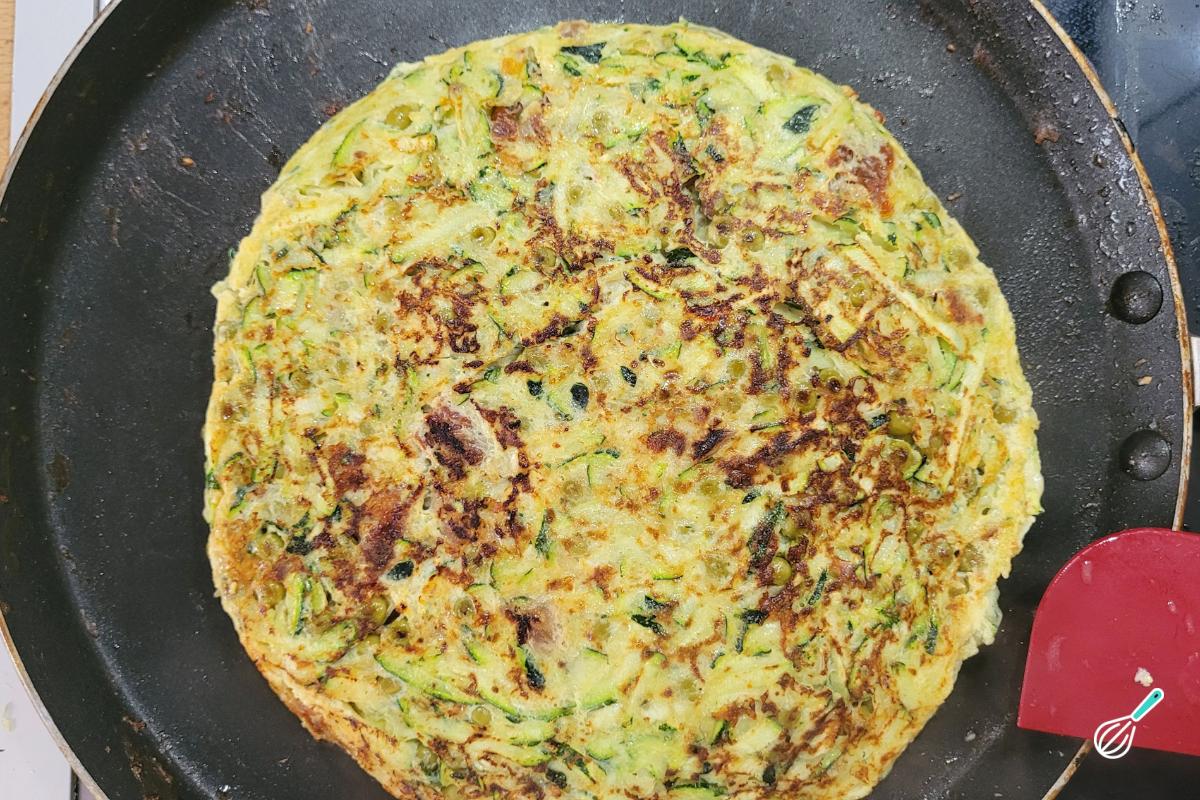 Deixe em fogo médio-alto para dourar o fundo. Quando dourar, ela soltará naturalmente do fundo da frigideira. Diminua o fogo e deixe mais uns dois minutos para cozinhar por dentro antes de virar.