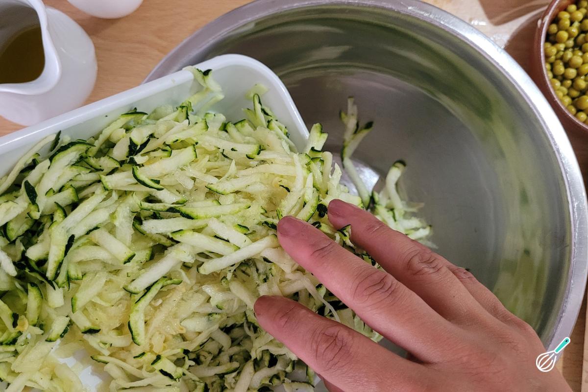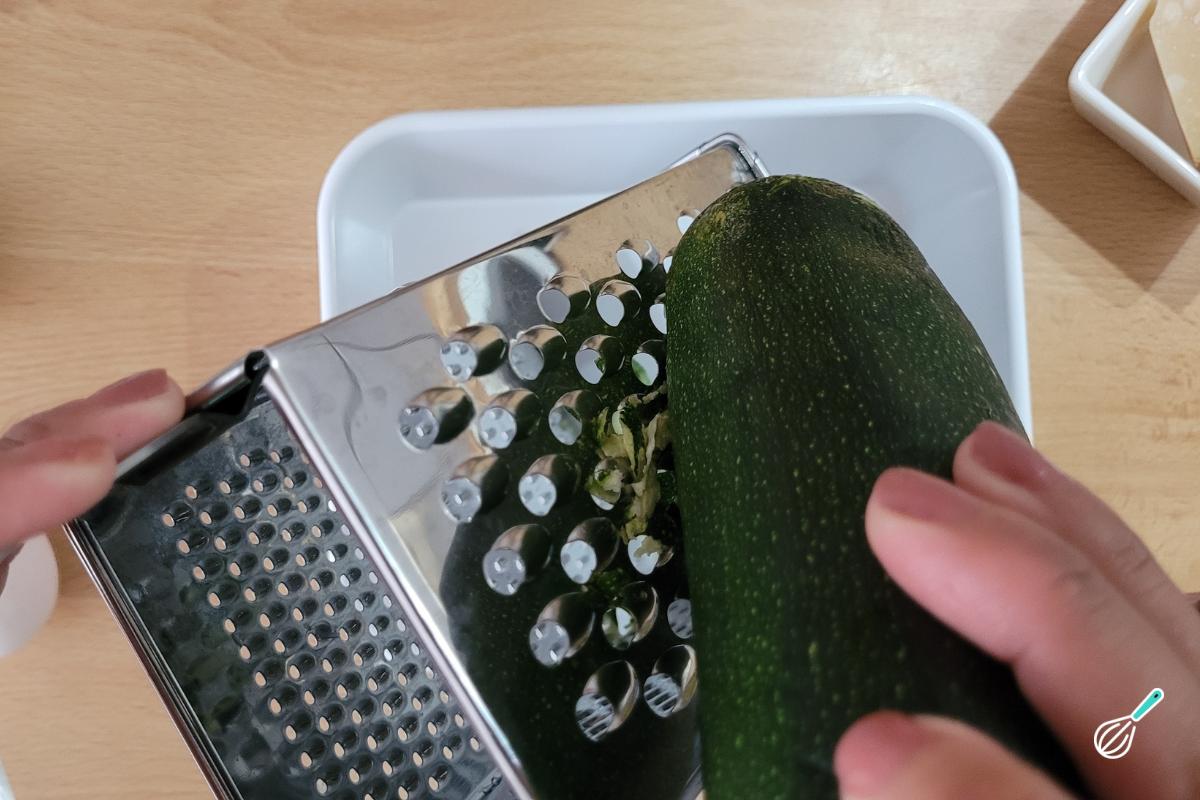 Rale a abobrinha. Como a abobrinha tem muita água, rale na parte grossa do ralador, porque ralando na parte fina, ela soltará muita água. Aqui, eu não fiz essa etapa, mas se você quiser garantir que a abobrinha não vai soltar muita água na fritada, você pode espremer a abobrinha em um pano de prato limpo para tirar o excesso de água.