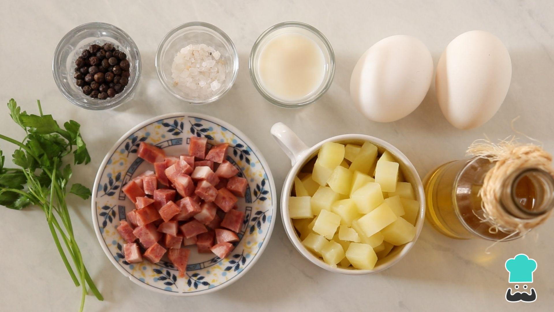 Separe os ingredientes da fritada. A batata já deve estar cozida com uma textura bem macia. Corte a linguiça calabresa em cubos e pique a salsinha.