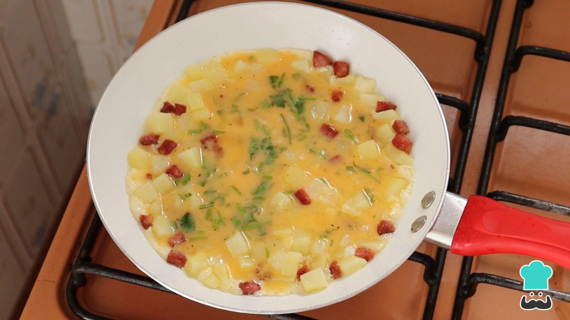 Em seguida despeje o ovo batido e temperado, baixe o fogo e cozinhe até dourar levemente.