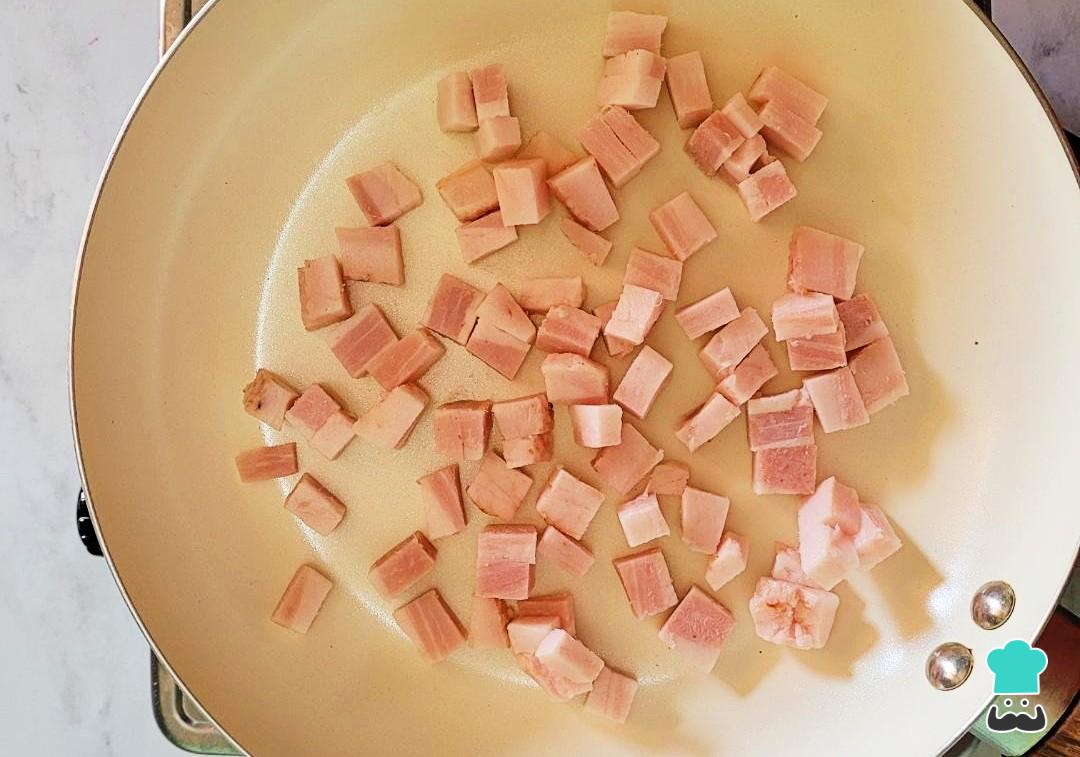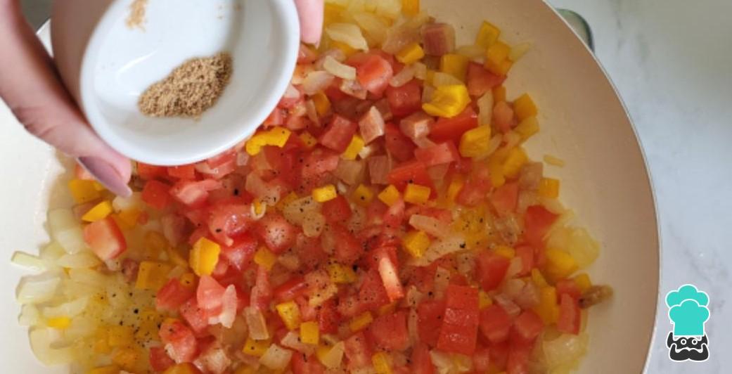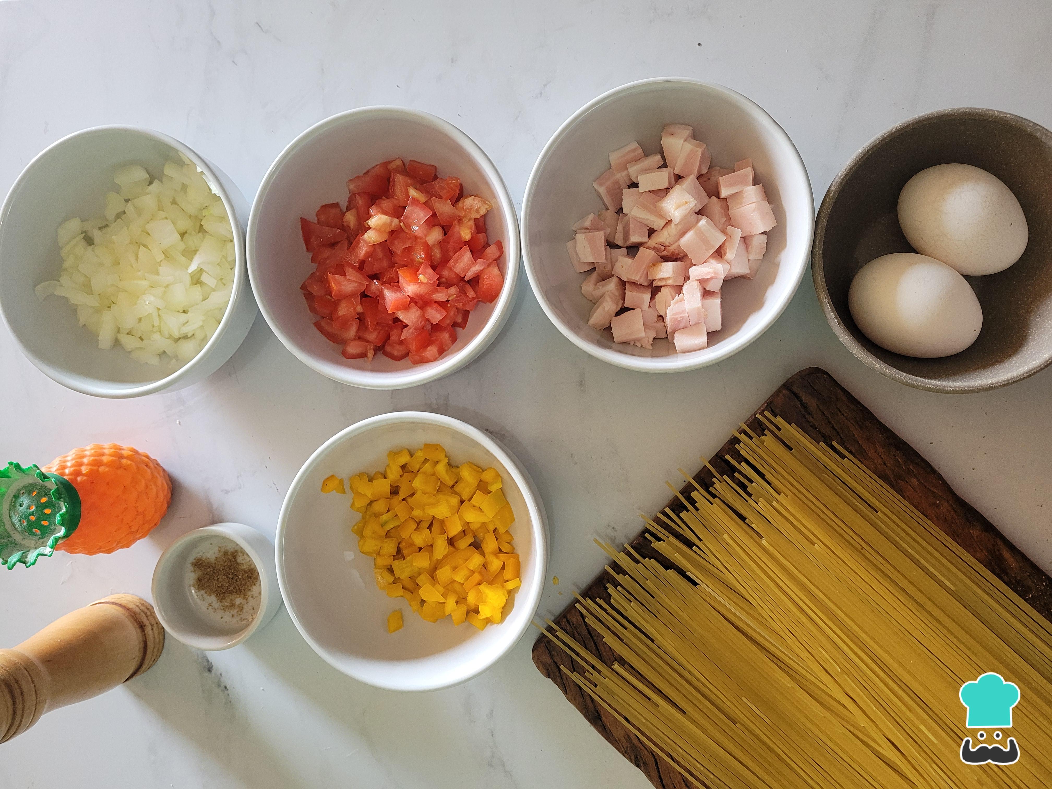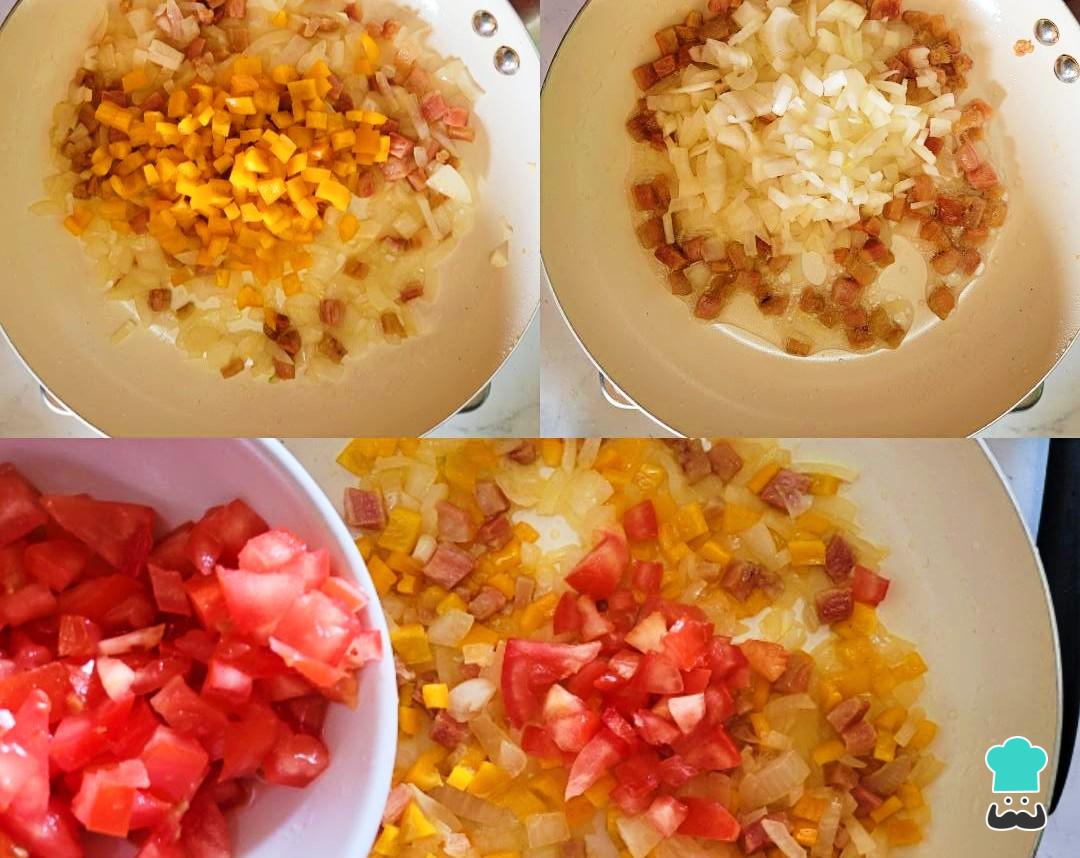Comece separando os ingredientes. Corte o pimentão, a cebola, o tomate e o bacon em cubinhos.
