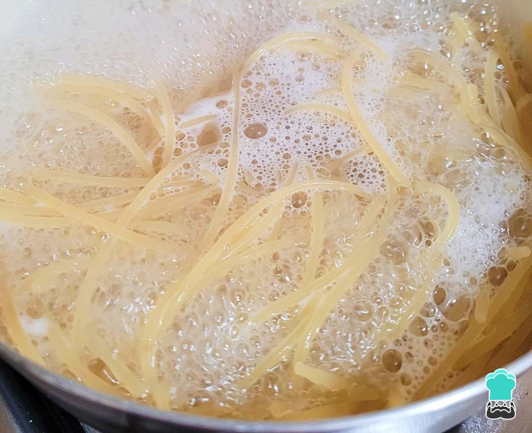 Você pode usar o macarrão que tiver já cozido sobrando na geladeira. Se a quantidade não for suficiente, cozinhe um pouco mais de macarrão conforme as instruções da embalagem (coloque água na panela e, quando começar a ferver, adicione a massa). Aqui estou usando o espaguete, mas você pode usar macarrão estilo penne, talharim ou fusilli. Depois de cozinhar, reserve.