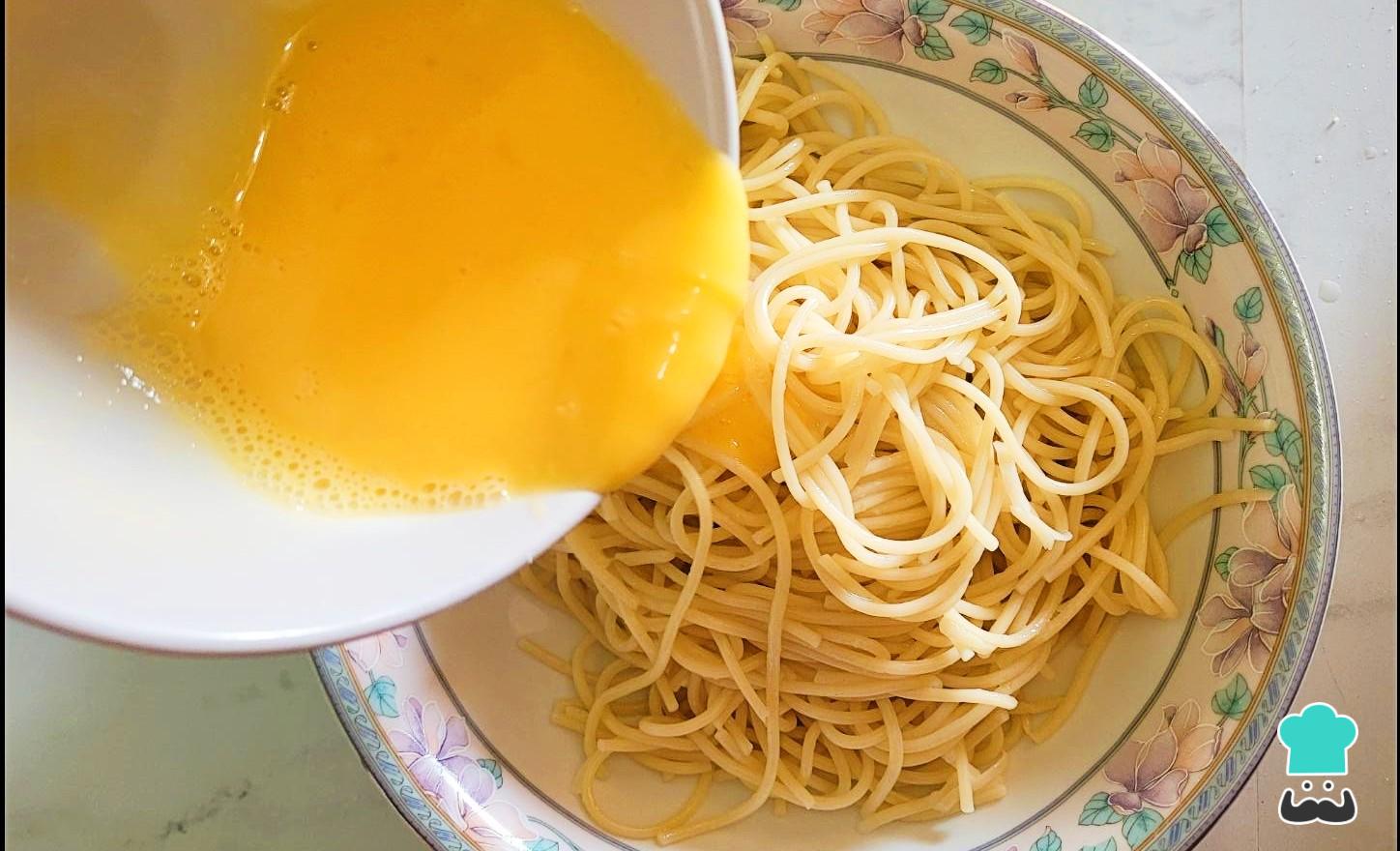 Enquanto isso, bata os dois ovos com um garfo e misture bem até que cubra todo o macarrão.