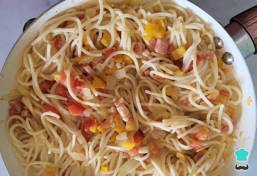 Coloque o macarrão na frigideira, misturando bem com todos os outros ingredientes.