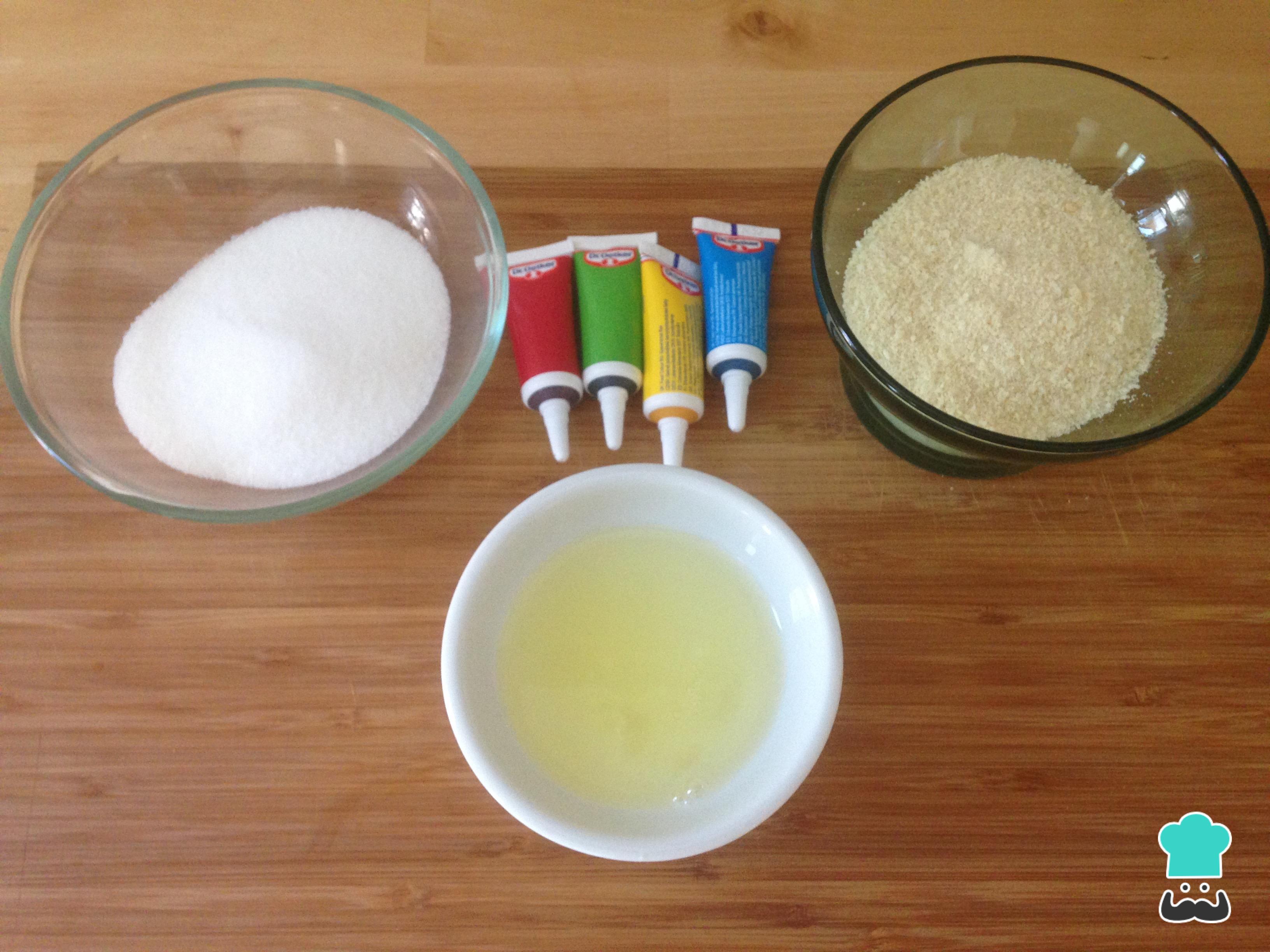 Comece por reunir os ingredientes desta receita de docinhos de marzipã. Usamos as cores indicadas porque vamos modelar maçãs, peras, bananas, laranjas e morangos.