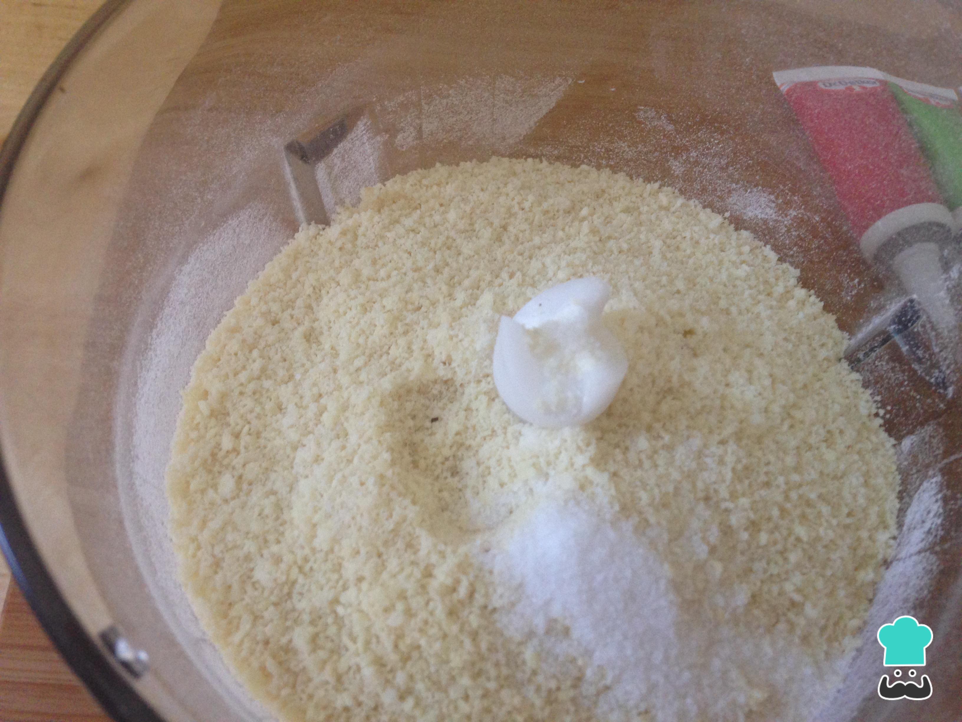 Num processador de alimentos misture a amêndoa com o açúcar e a clara de ovo, até obter uma pasta.