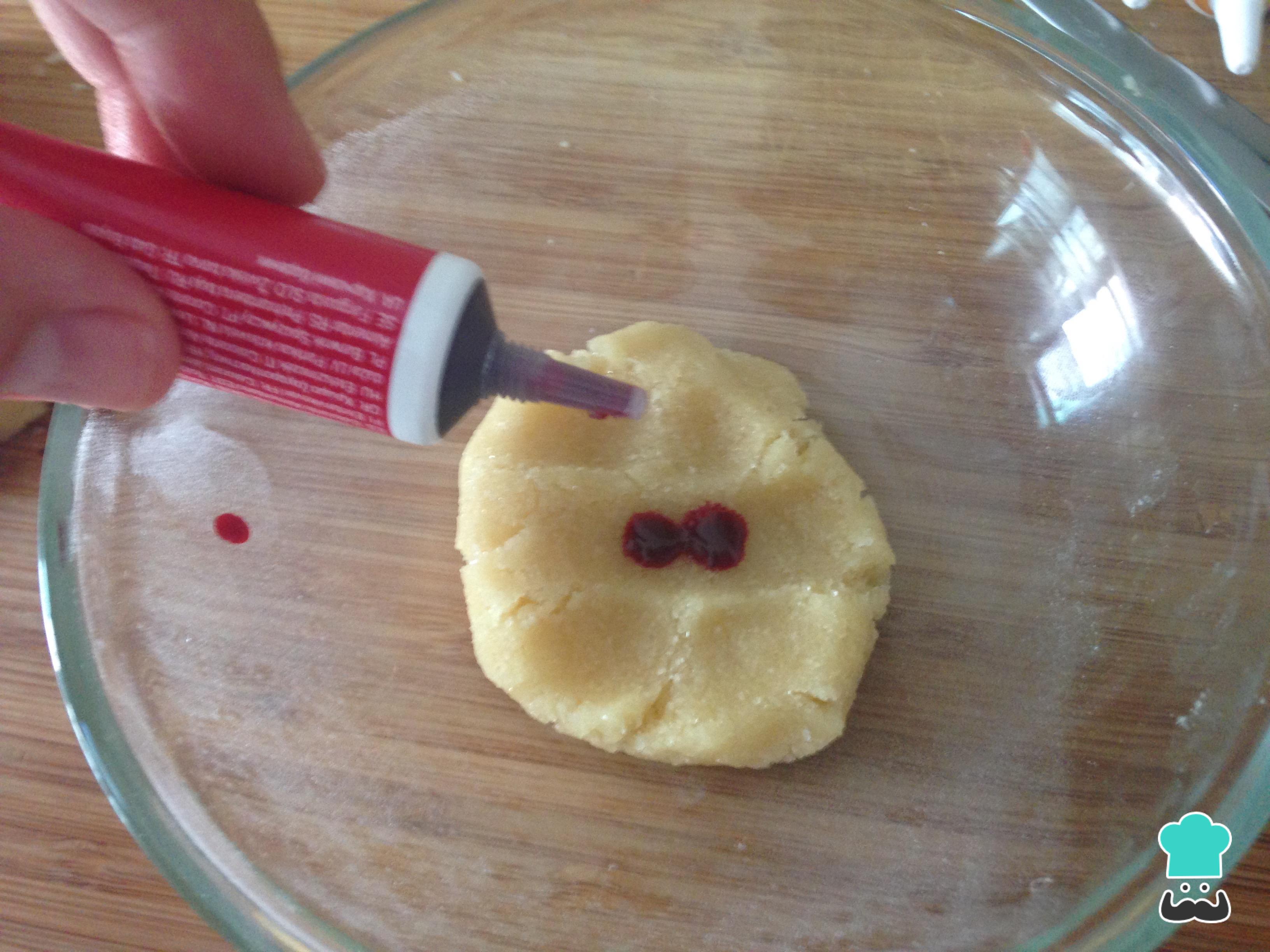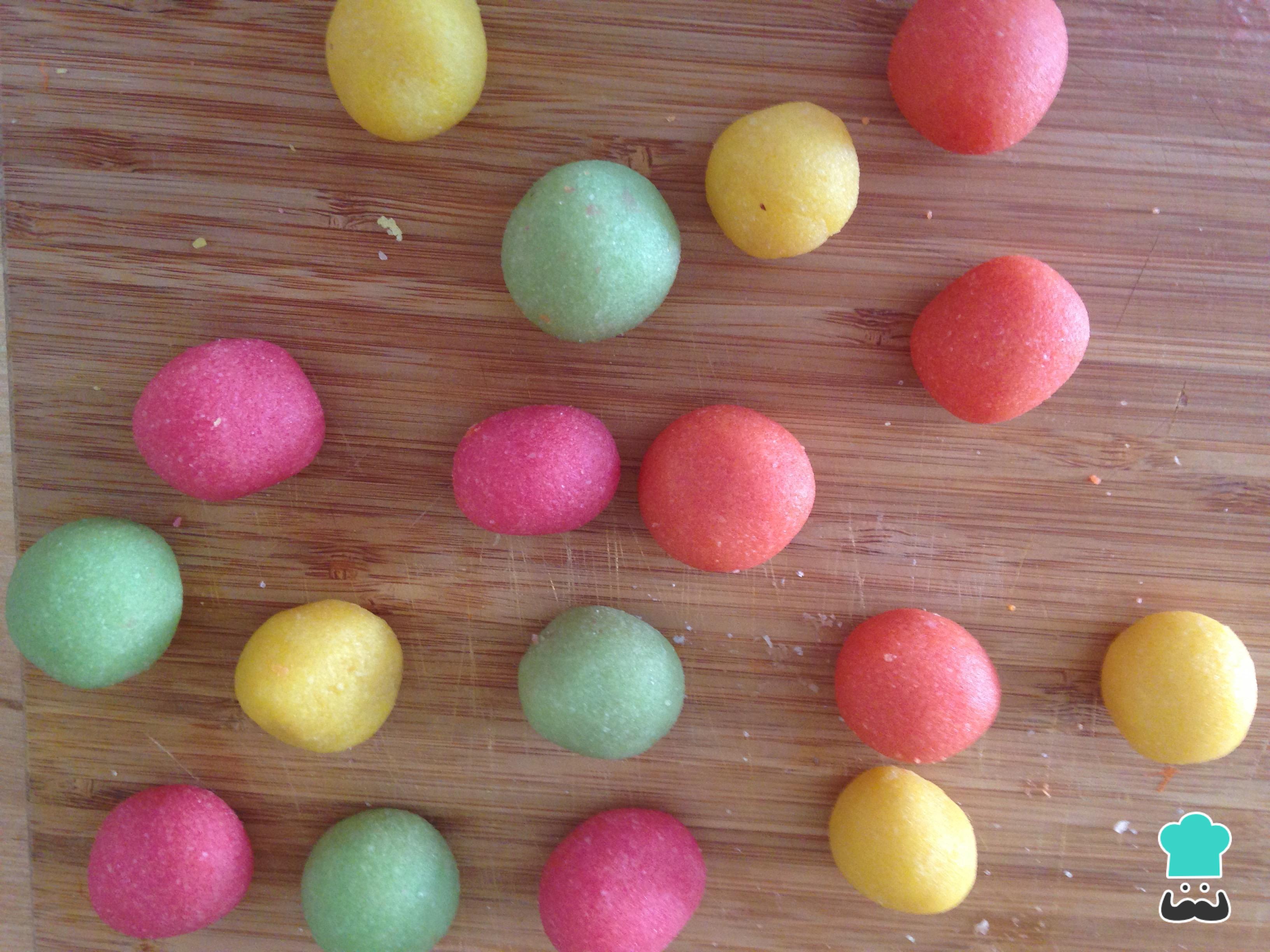 Misture bem o corante com a pasta da amêndoa, e modele bolinhas.