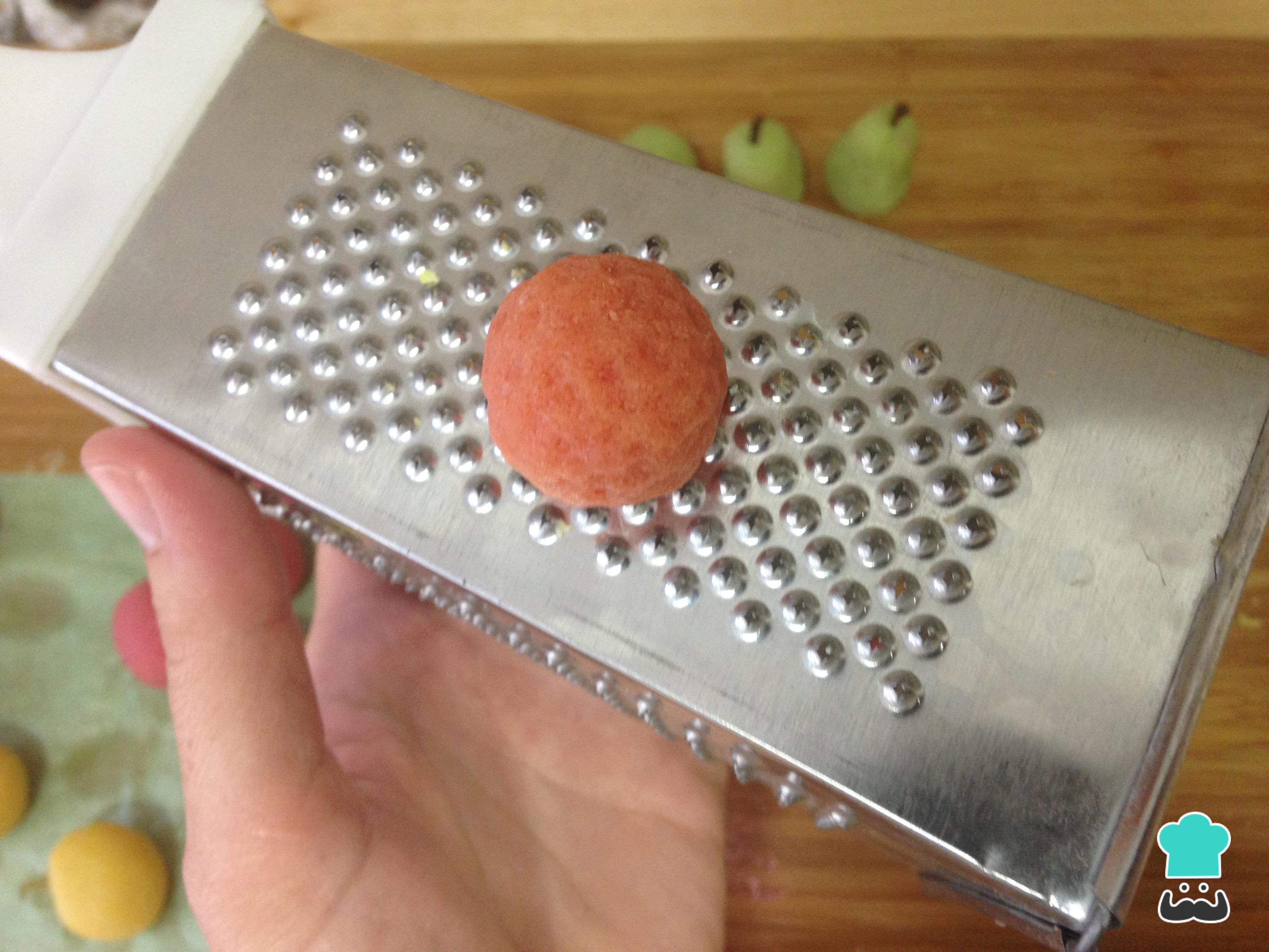 Modele as bolinhas de marzipã de acordo com as frutas que quer fazer, e afunde um cravinho nas maçãs e peras. Para conferir textura às bolinhas que serão as laranjas e os morangos, simplesmente pressione-as levemente sobre um ralador como o da fotografia.