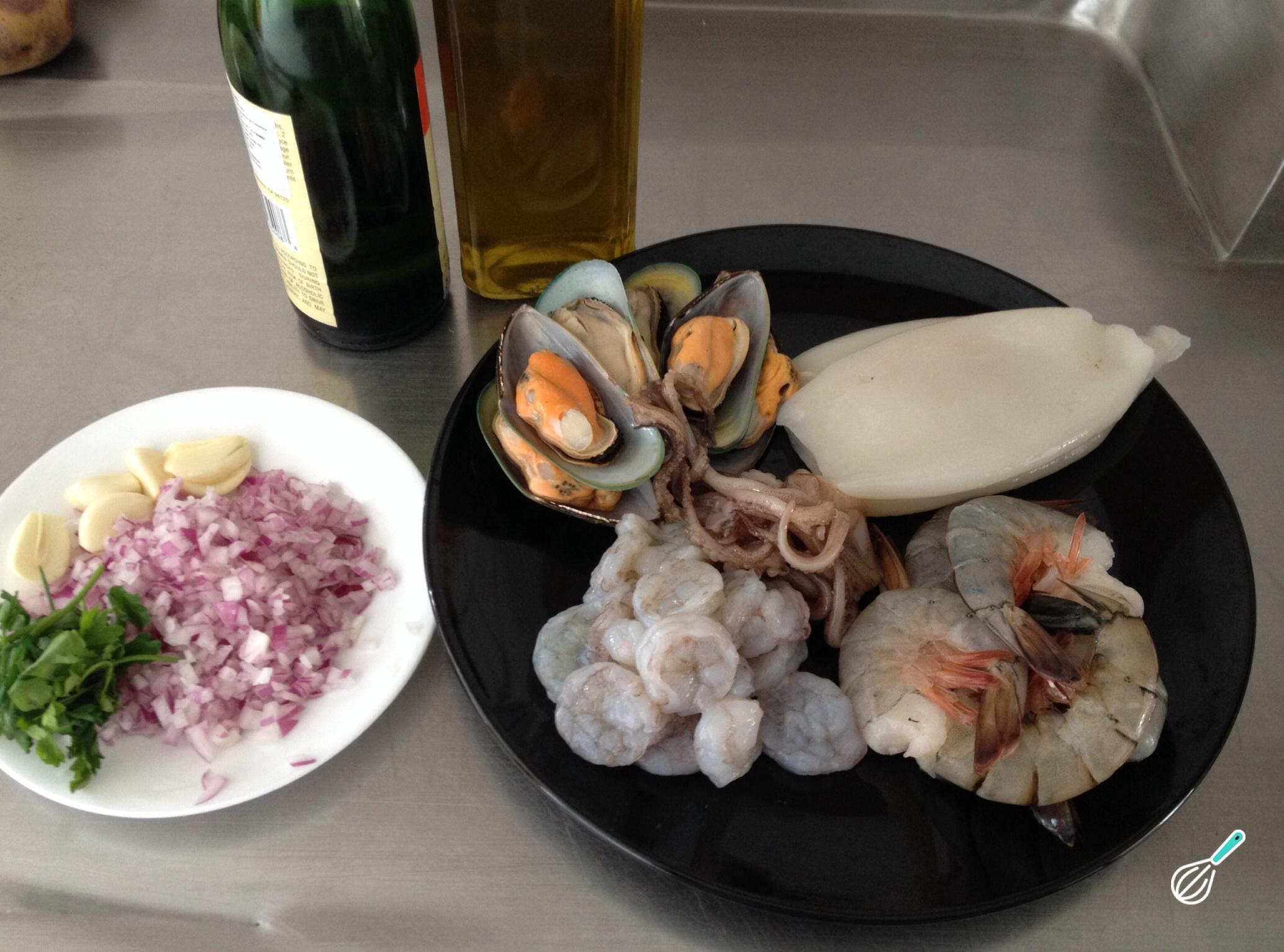 Para fazer esta deliciosa receita de frutos do mar, comece por reunir os ingredientes!