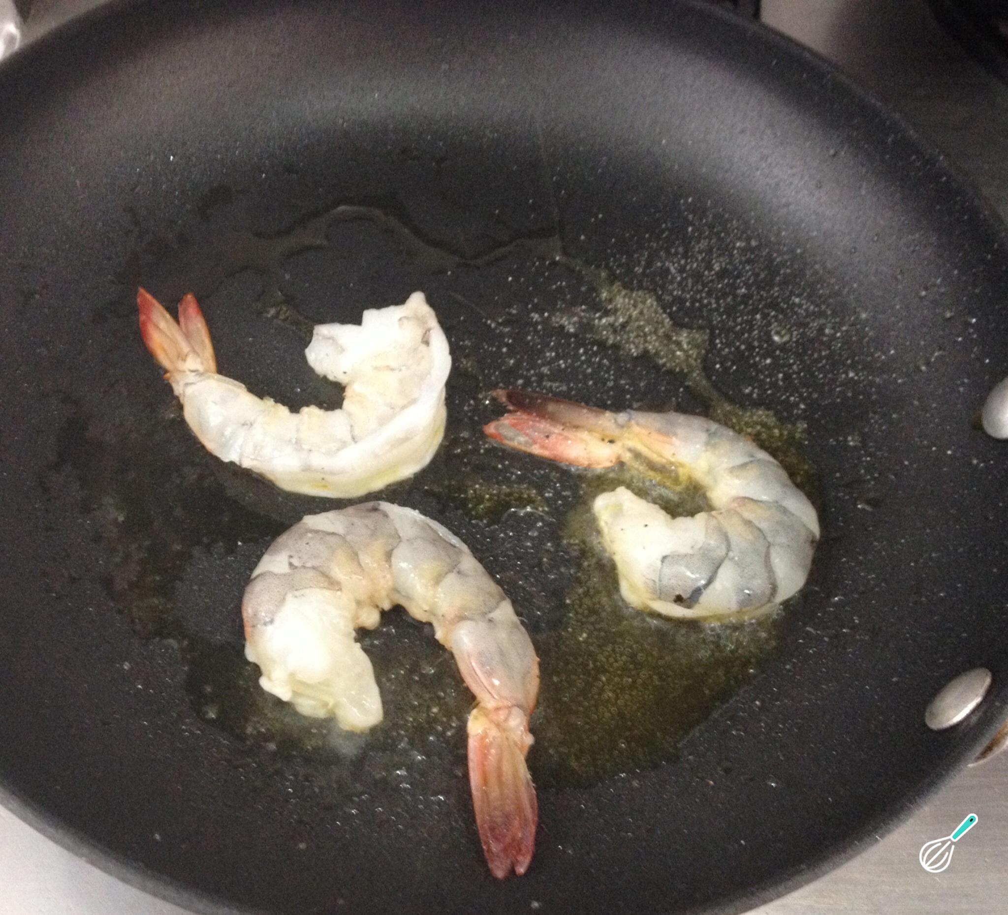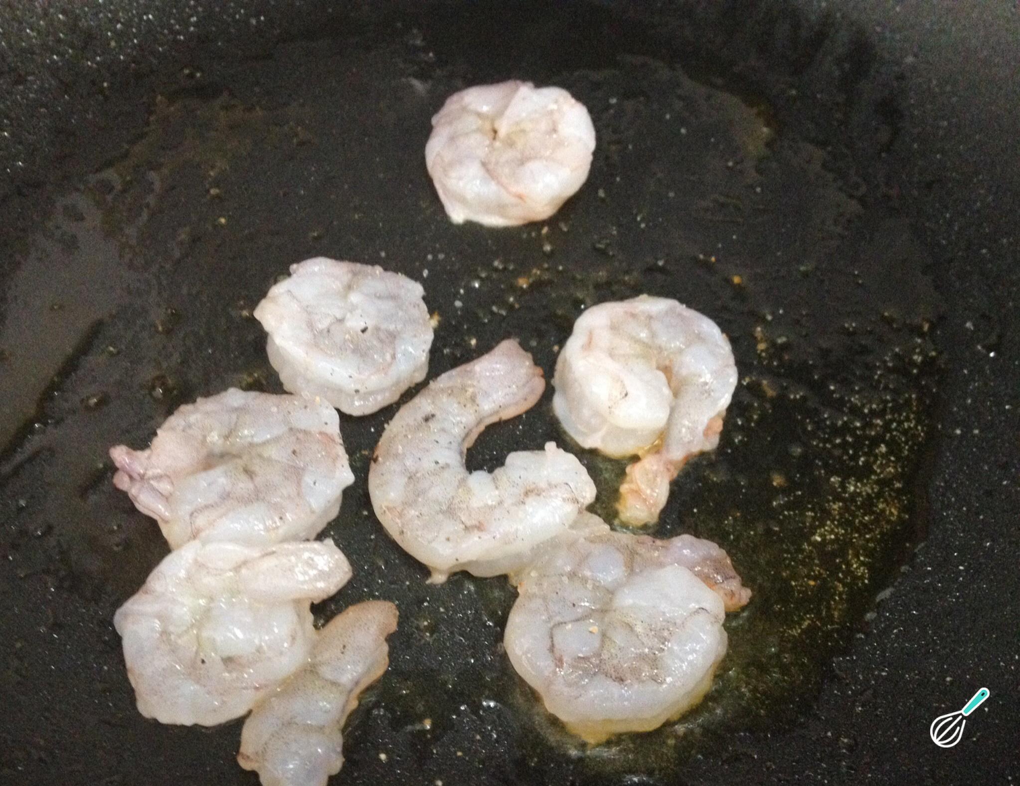 Descasque os camarões grandes, retire a veia e tempere. Leve ao fogo médio uma frigideira com um pouco de óleo ou azeite de oliva, e cozinhe nela os camarões, por 1 minuto de ambos os lados.