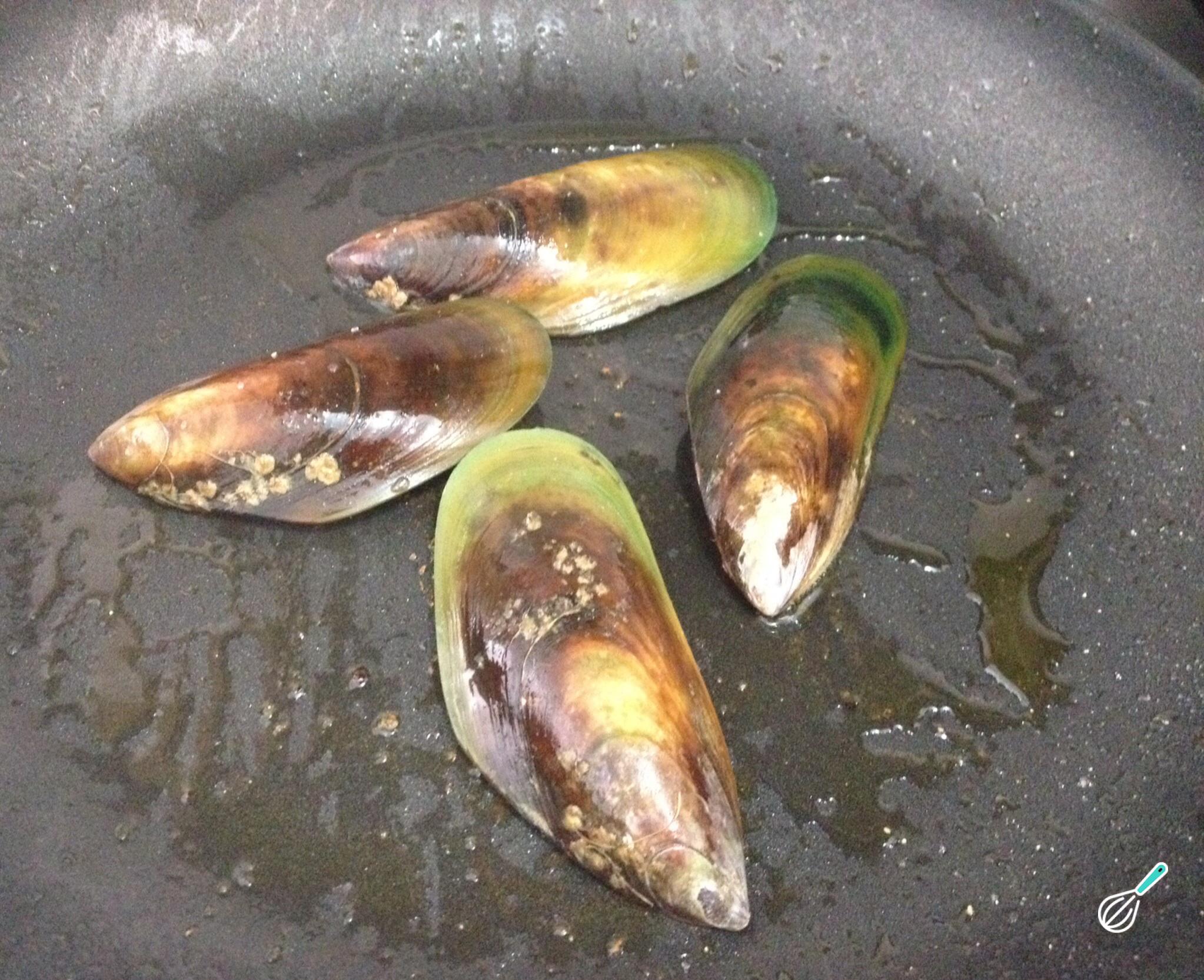 Seguidamente deixe dourar os mexilhões por apenas 30 segundos. Retire e reserve, para cozinhar o próximo ingrediente desta receita de frutos do mar.