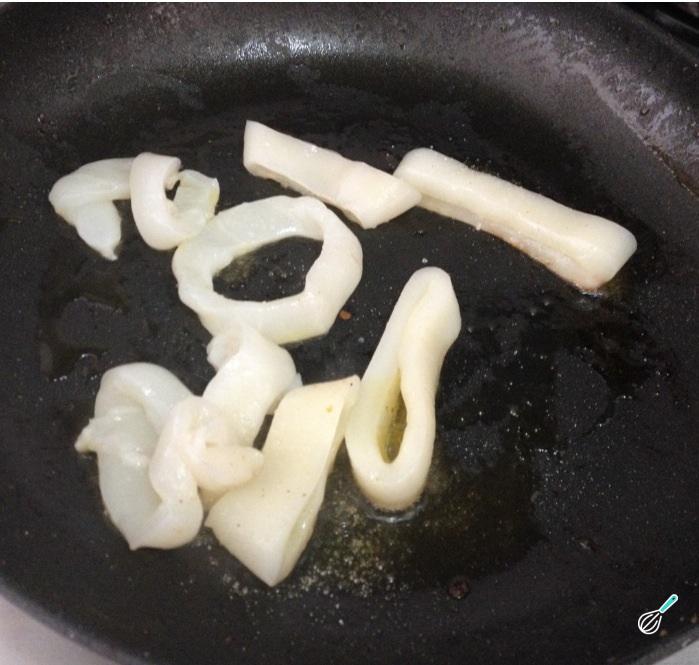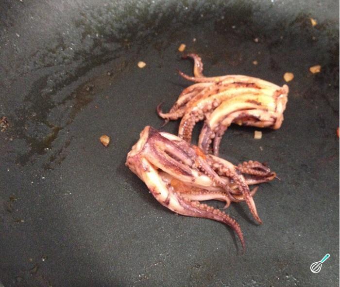Finalmente, cozinhe a lula cortada em rodelas, por 1 minuto. Tempere com sal e pimenta, retire e reserve.