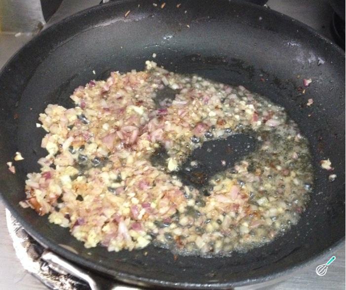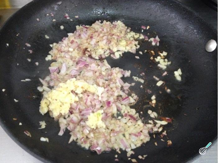 O passo seguinte destes frutos do mar ao alho e óleo é adicionar à frigideira a cebola e os alhos picados, e cozinhar em fogo alto por 2 minutos, até dourar.