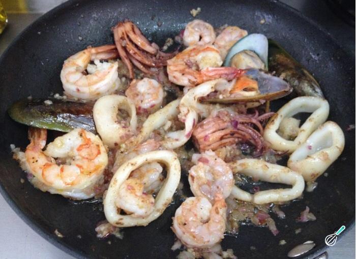 Finalmente volte com todos os frutos do mar à frigideira, misture tudo e retifique o sabor com sal e pimenta.