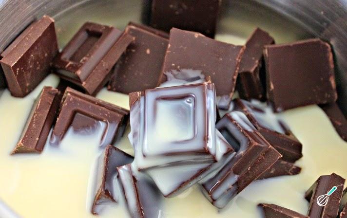 Separadamente, coloque o chocolate amargo picado em uma panela juntamente com o leite condensado e aqueça em banho-maria em fogo baixo.