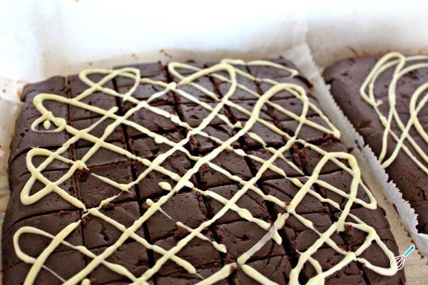 Quando o fudge estiver firme, retire do molde, mantendo o papel manteiga. Para preparar a decoração, derreta o chocolate branco em banho maria e use-o para desenhar sobre o fudge.