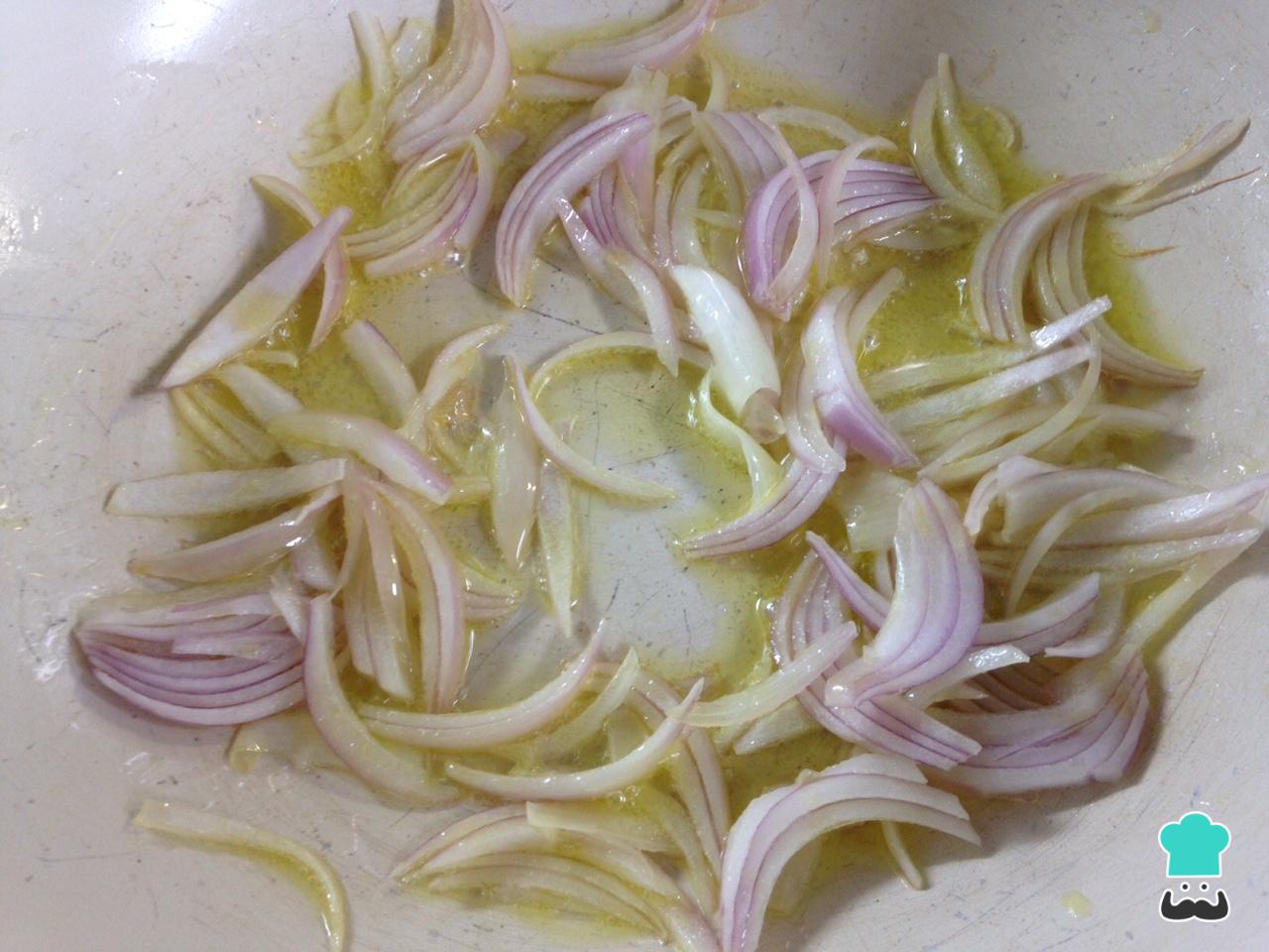 Cozinhe o macarrão em água fervente, do jeito tradicional e, enquanto isso, refogue a cebola cortada em meias-luas no azeite.
