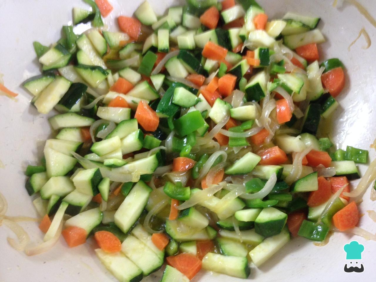 Quando a cebola estiver macia, adicione os legumes restantes, previamente lavados e picados, e deixe refogar tudo em fogo baixo por 10 minutos.