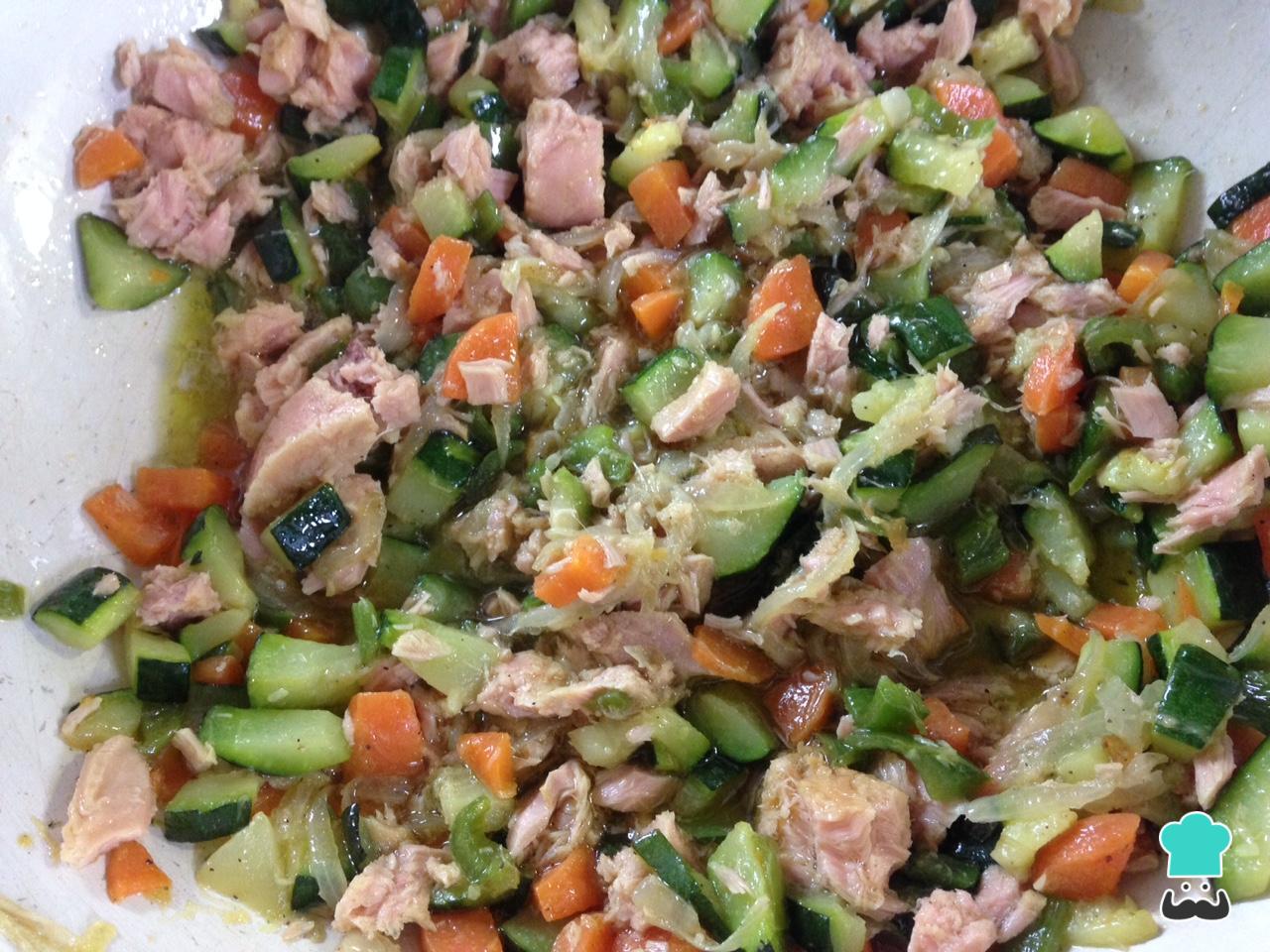 Após o tempo indicado, acrescente o atum escorrido aos legumes, retifique o sabor com sal e pimenta, e misture tudo.