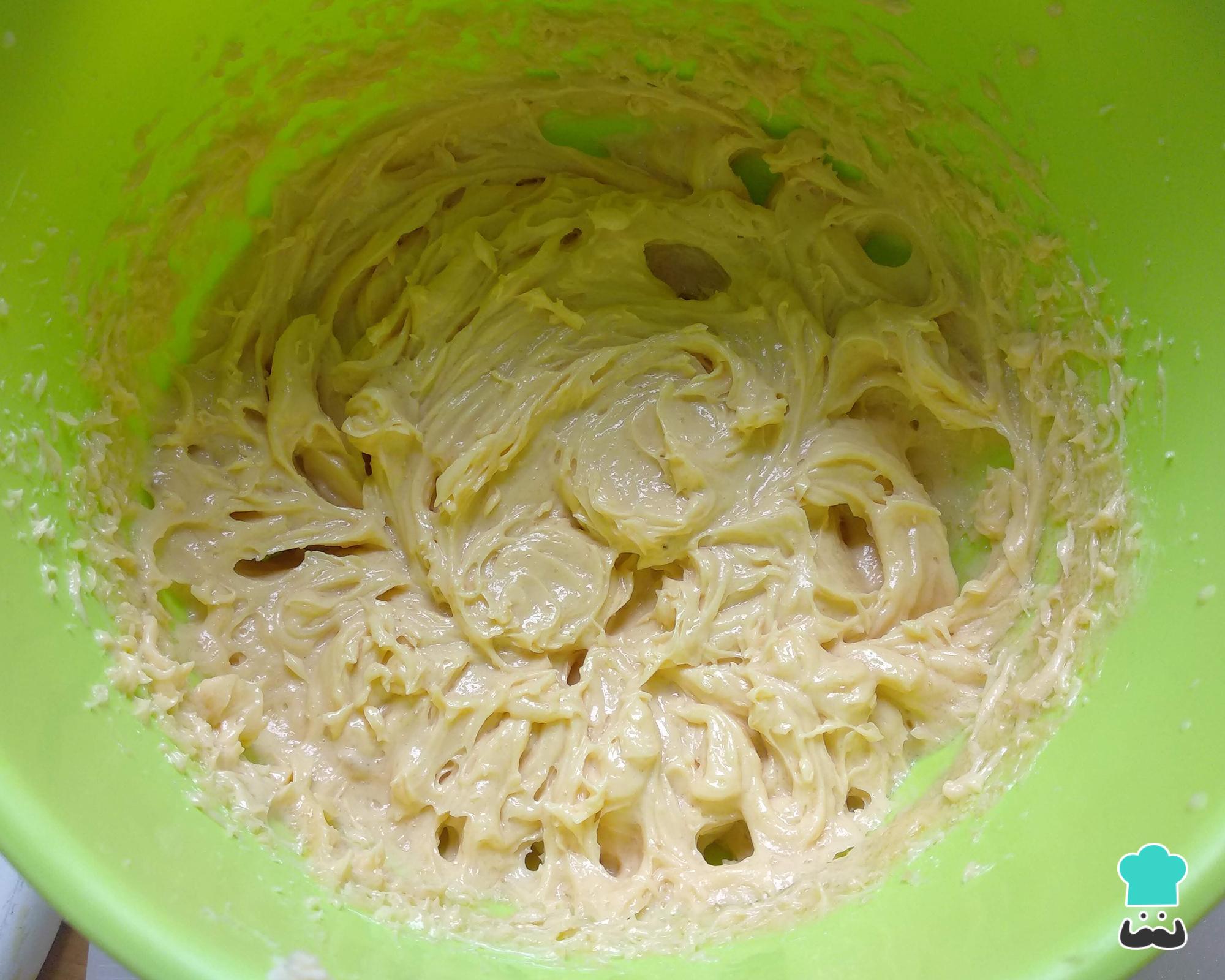 Comece por bater muito bem o açúcar com a manteiga. Junte 2 ovos e continue batendo até obter um creme com os grãos de açúcar bem dissolvidos.