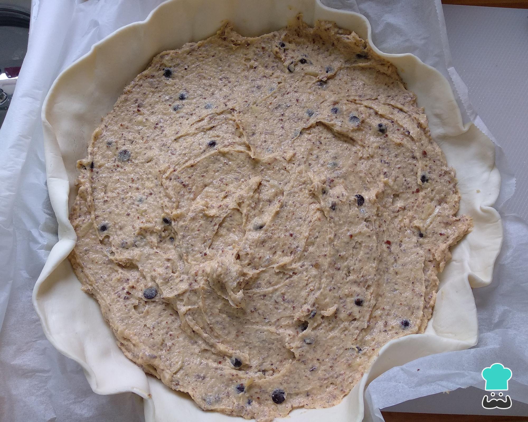 Abra uma das massas folhadas em uma forma de torta e coloque o creme anterior no centro, espalhando bem com uma colher para ficar lisinho.