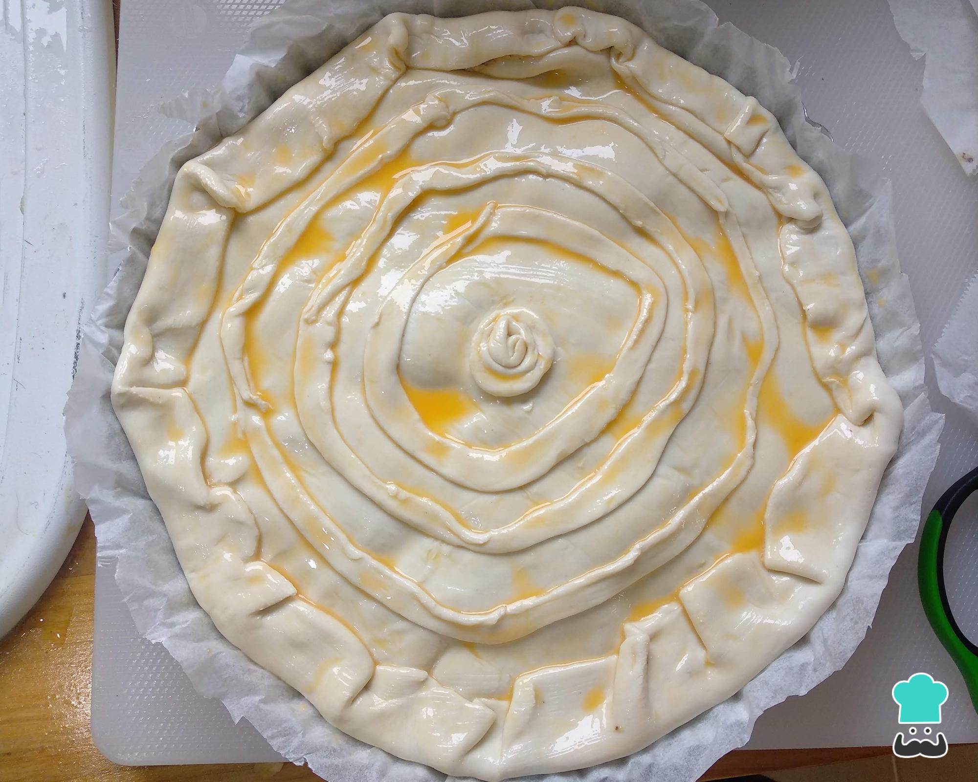 Cubra o recheio com a outra unidade de massa folhada e dobre as beiradas da massa para dentro. Bata o ovo restante e pincele a massa com ele, para ficar brilhante após assar.