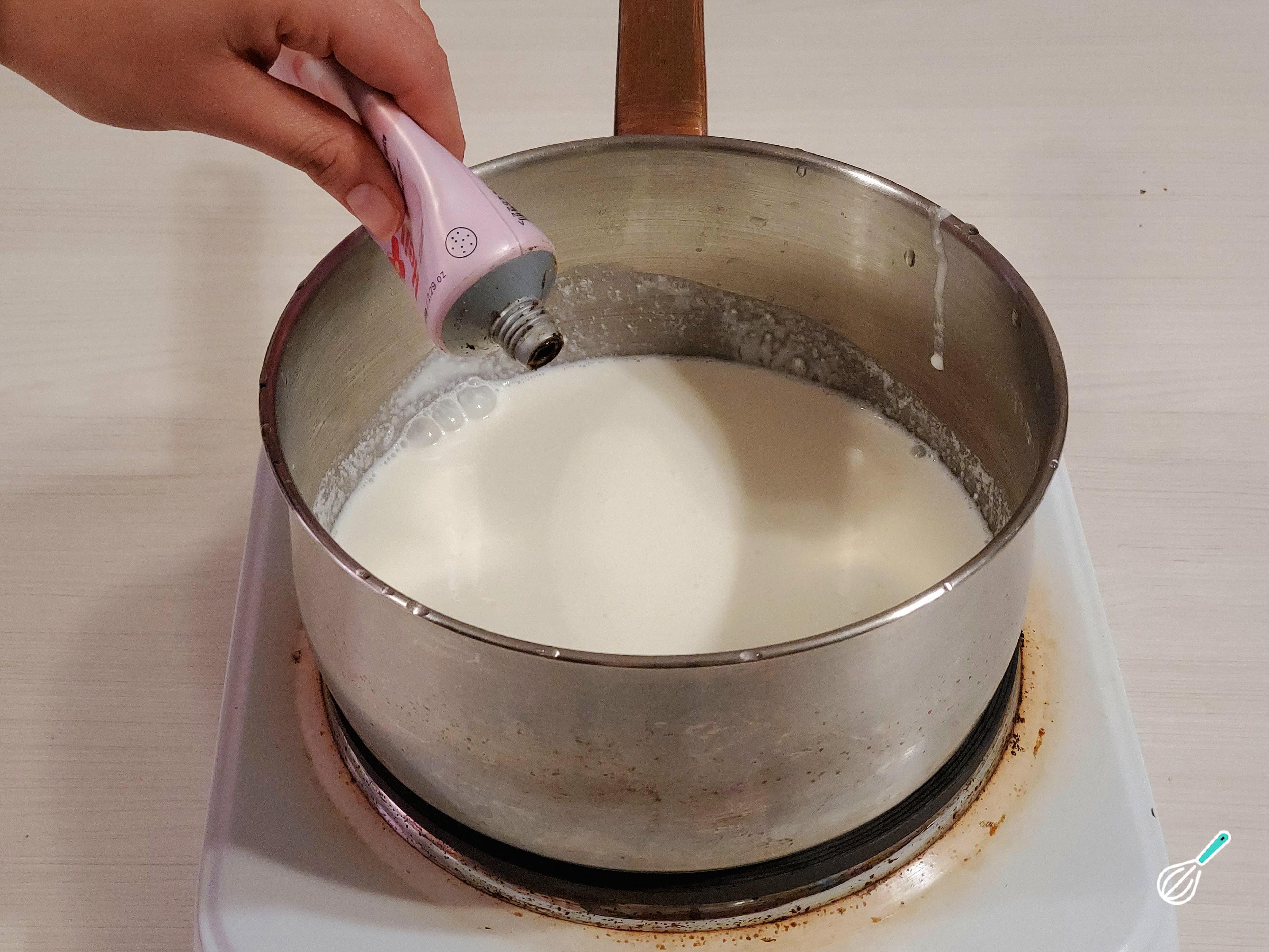 Comece preparando um creme de confeiteiro. Para isso, coloque o leite em uma panela e adicione a essência de baunilha. Coloque a panela em fogo médio a baixo e deixe ferver.