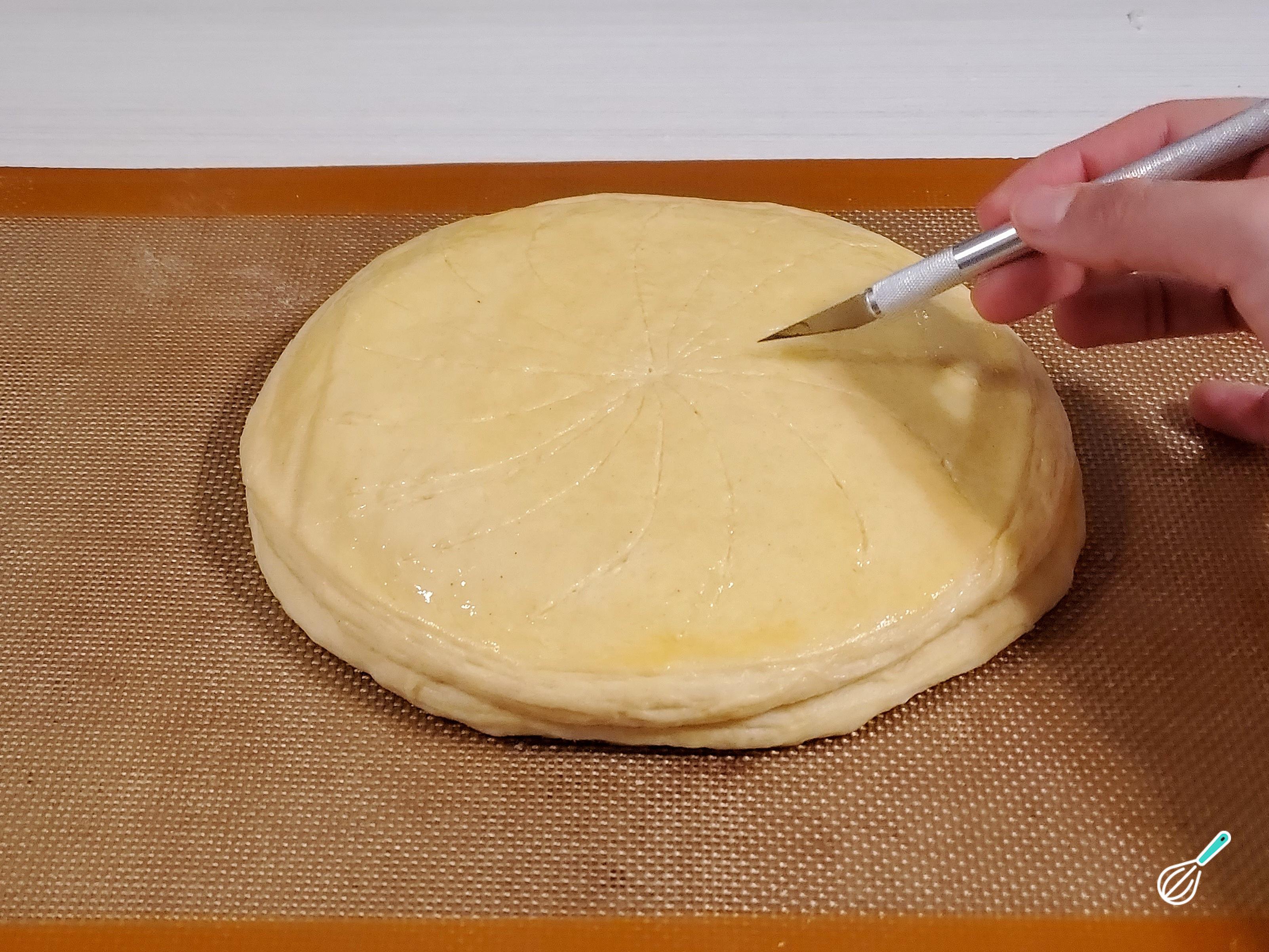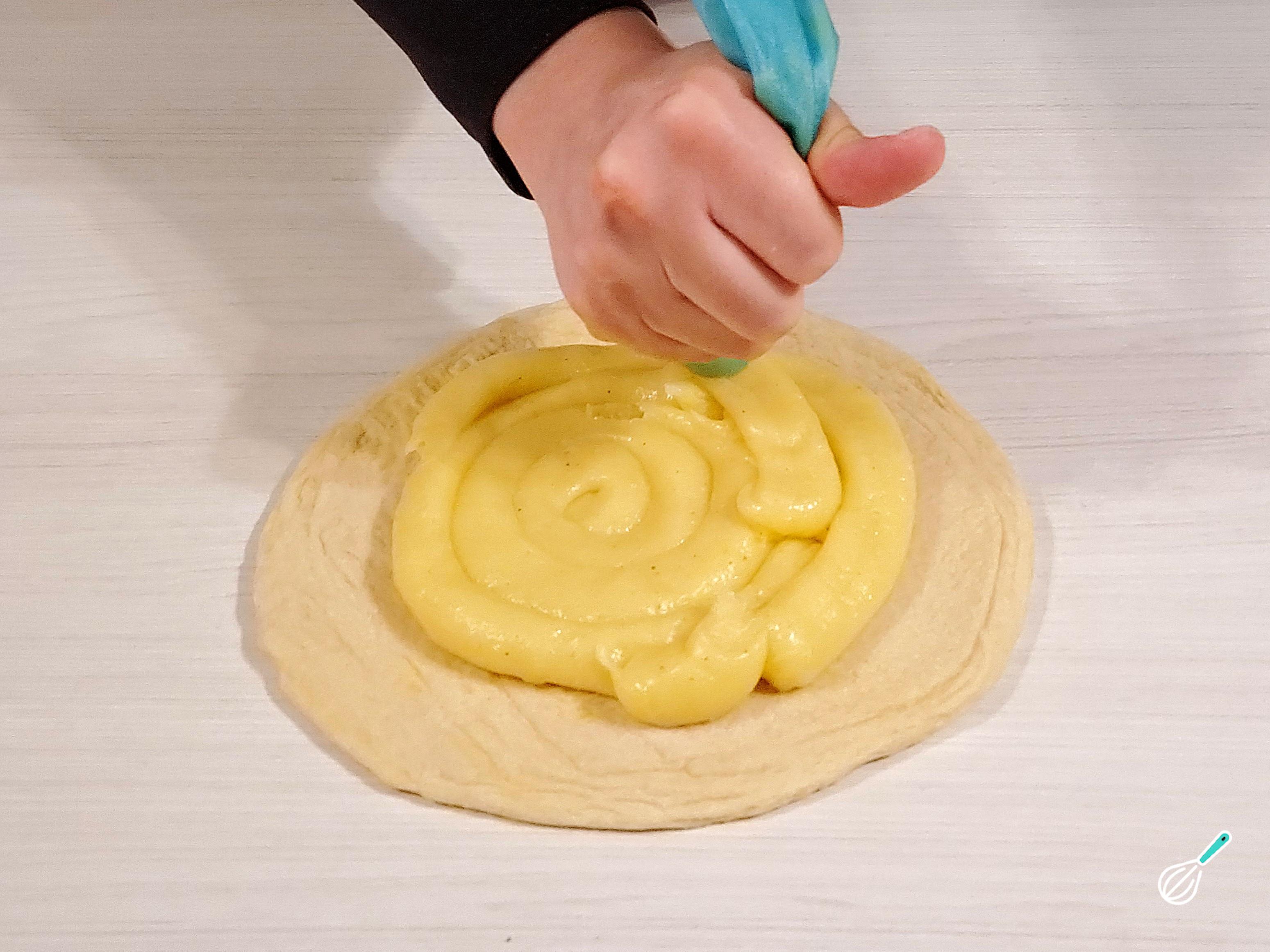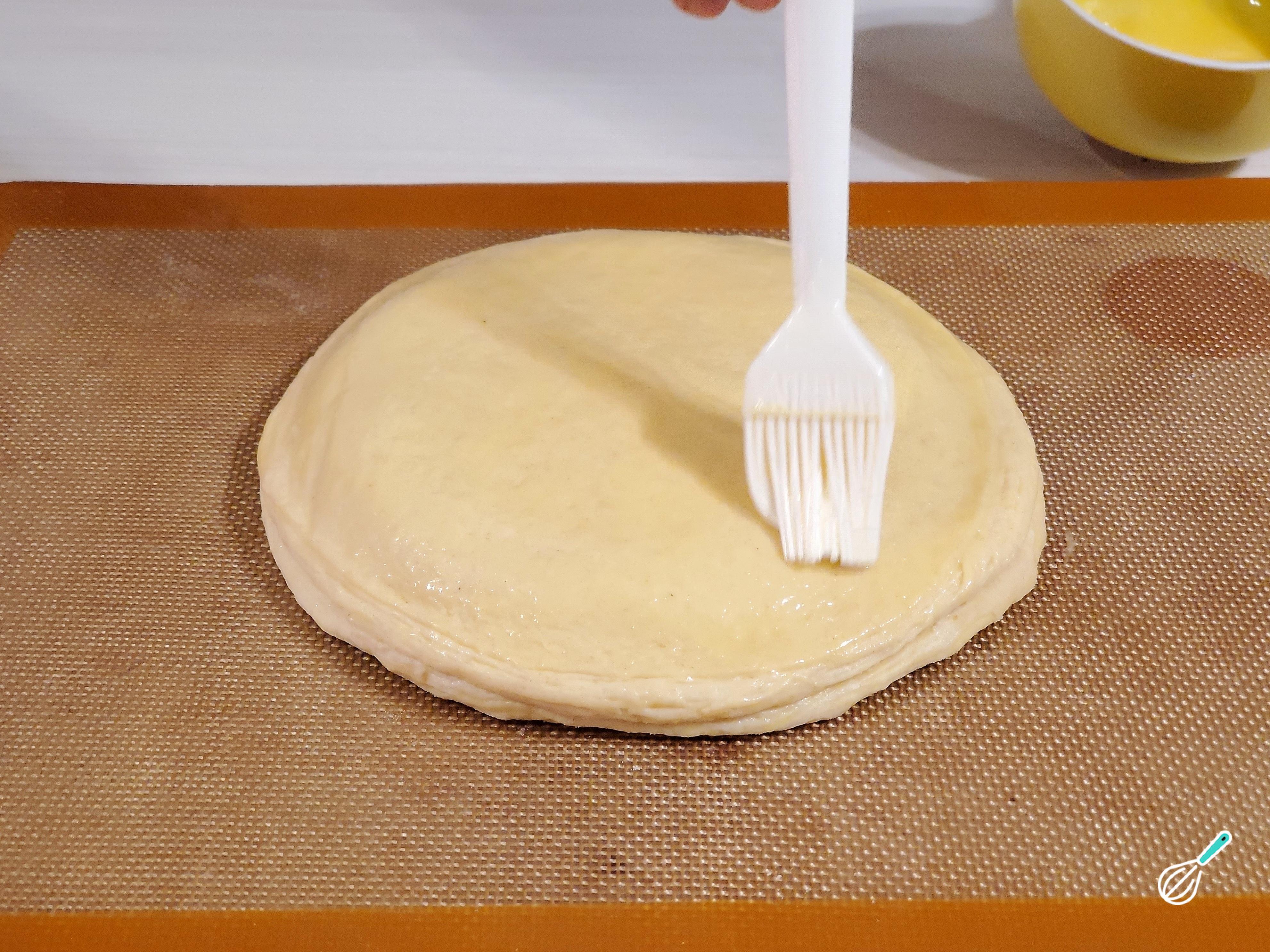 No disco menor, faça uma espiral com o creme de frangipane, deixando uma borda de cerca de 2 cm sem recheio. Pincele água na borda.