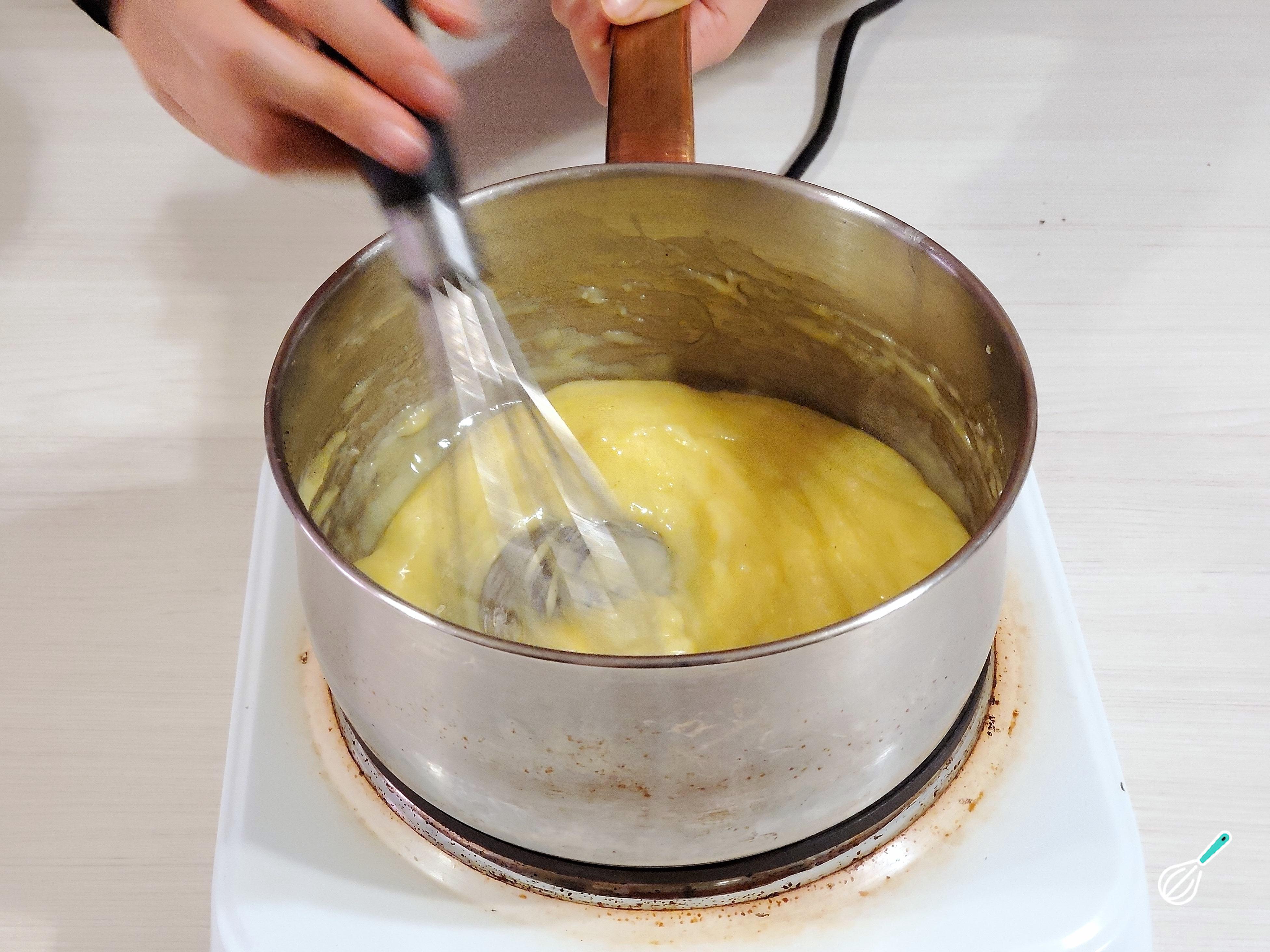 Quando o leite estiver prestes a ferver, despeje-o gradualmente sobre a mistura de gema de ovo para evitar que coagule e, em seguida, retorne toda a mistura à panela. Aqueça em fogo médio a baixo, mexendo sempre, até ferver e mantenha por mais 3 minutos.