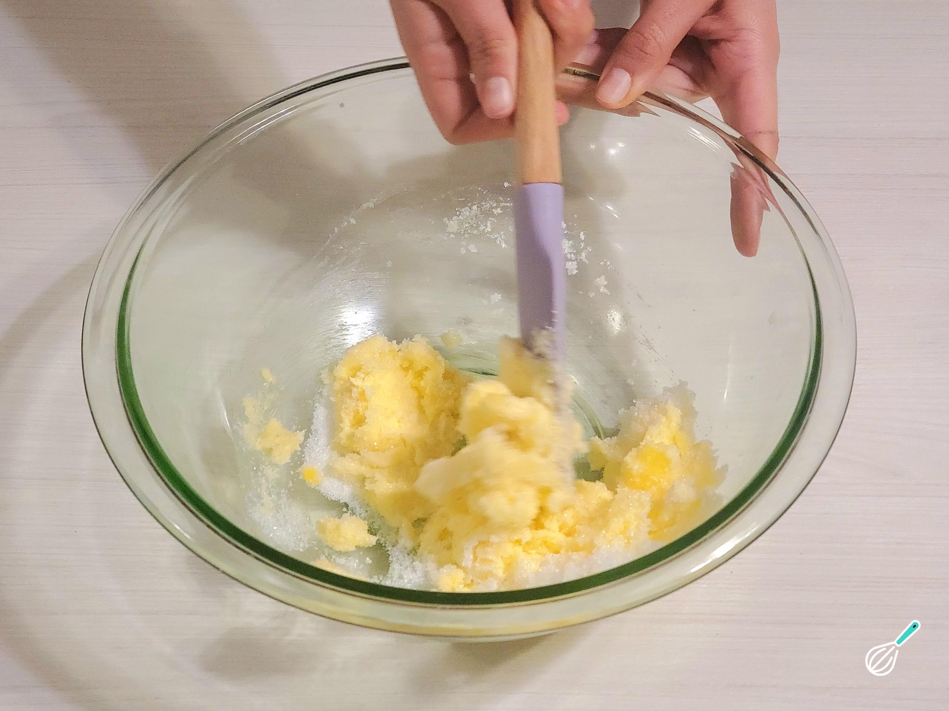 Para preparar o creme de amêndoas, coloque a manteiga em temperatura ambiente junto com o açúcar em uma tigela. Misture bem até obter um creme homogêneo.