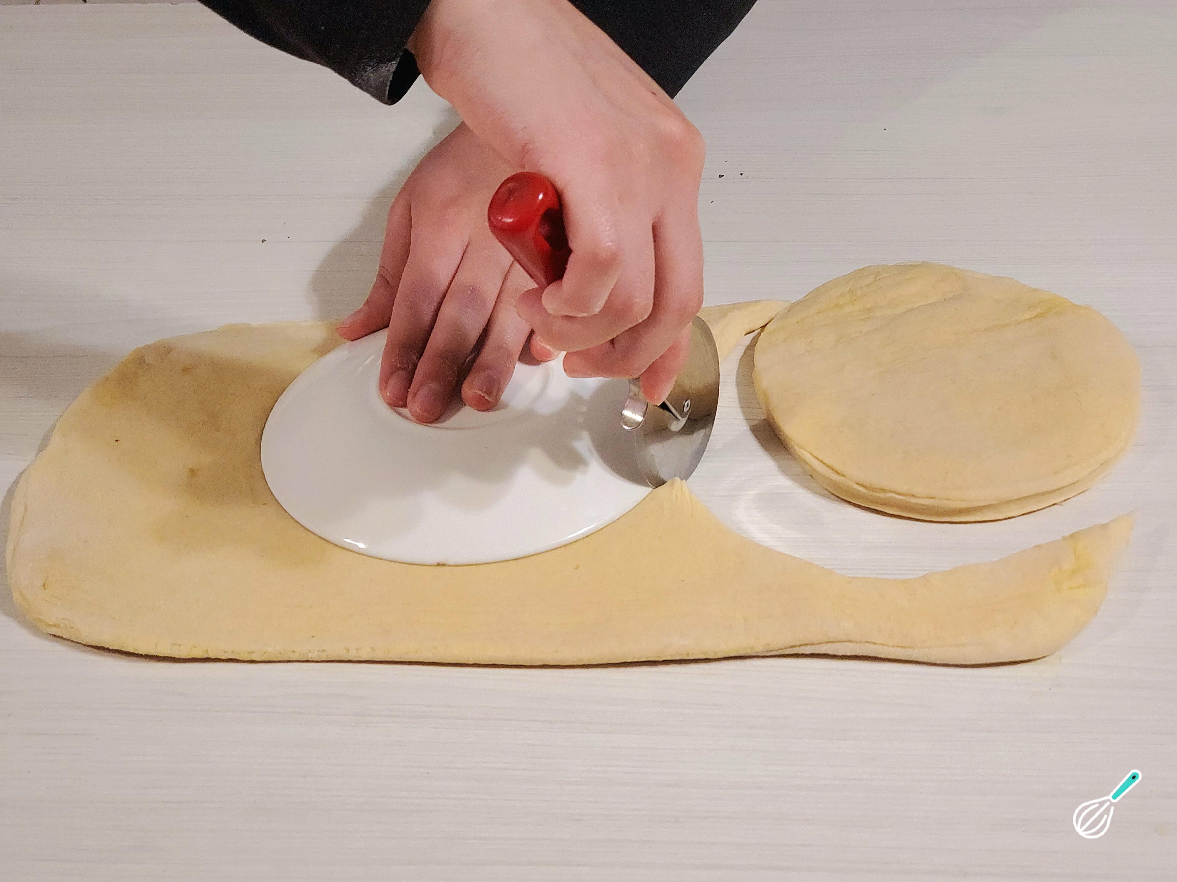 Abra a massa folhada e corte dois discos, um de cerca de 15 cm e outro de cerca de 18 cm.
