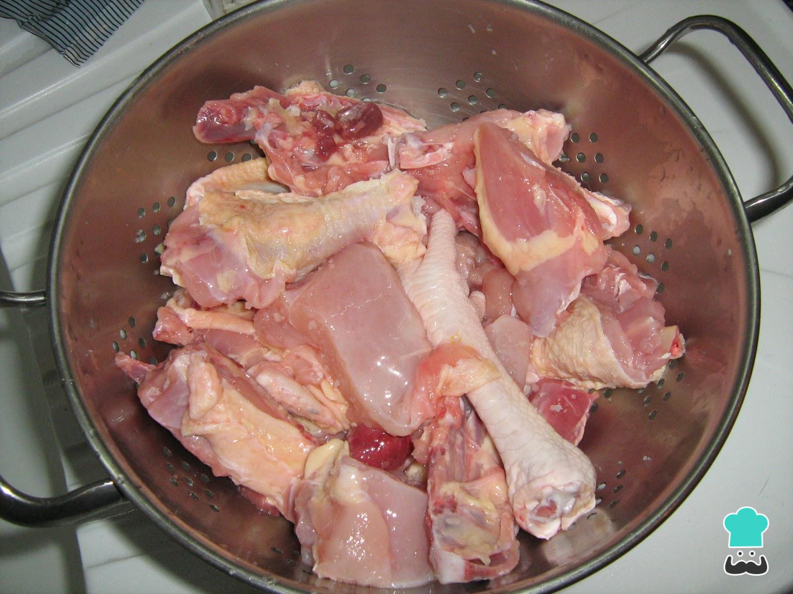 O primeiro passo da receita de galinha caipira com quiabo é temperar a galinha com os dentes de alho picados, o colorau, sal e pimenta.