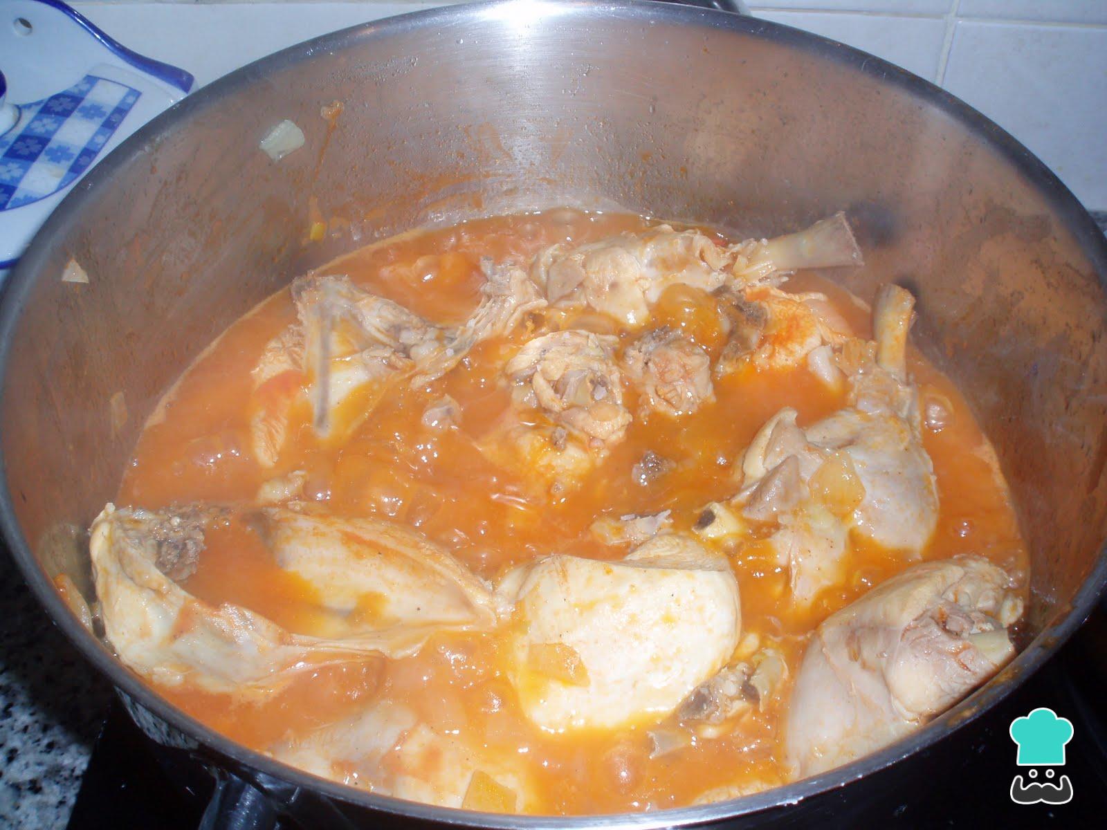 Leve ao fogo médio uma panela com o azeite as cebolas picadas. Quando a cebola estiver macia, acrescente os tomates picados e os pedaços de frango, cozinhe por 5-10 minutos.