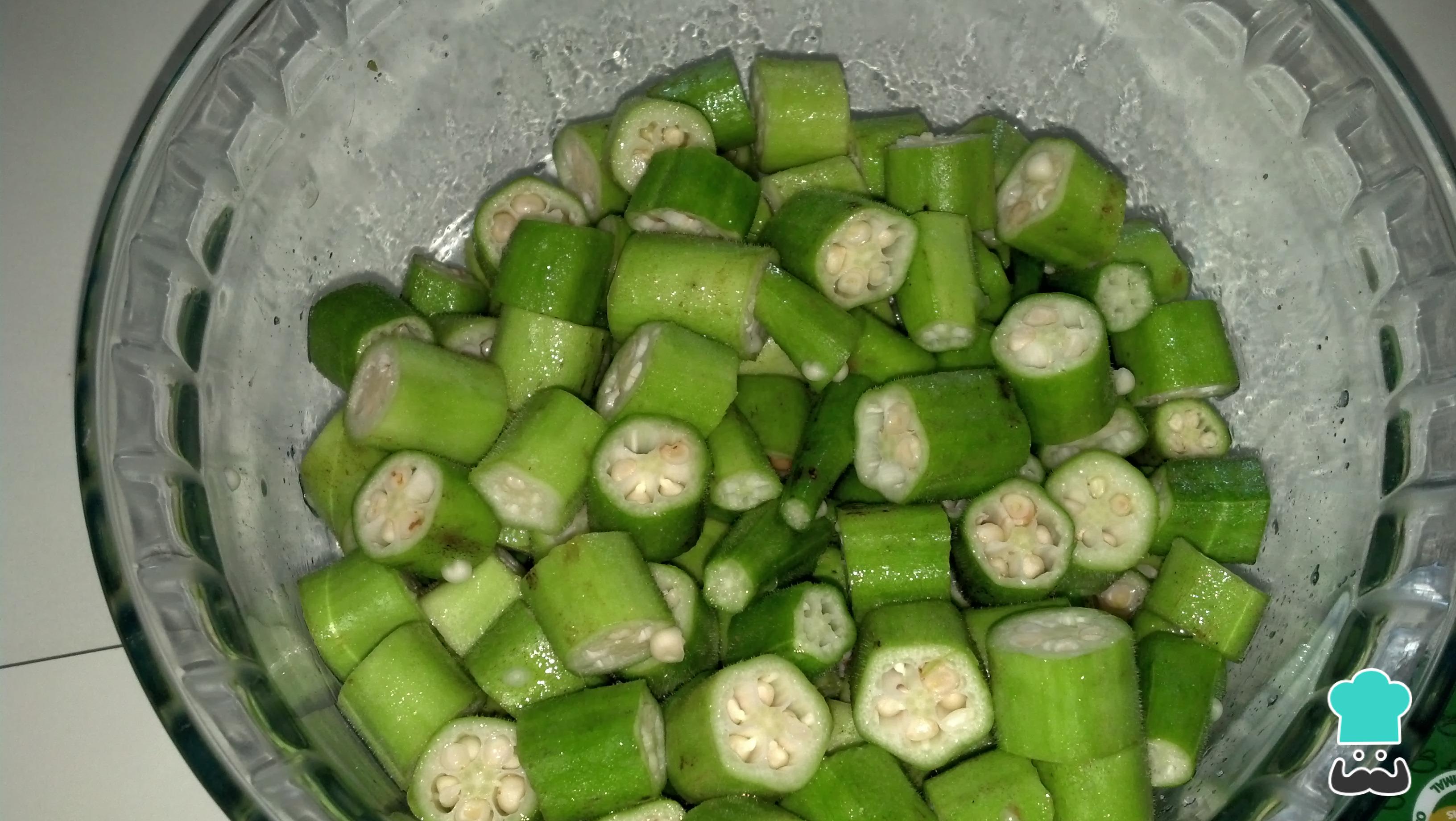 Enquanto isso prepare o quiabo: lave-o bem e seque. Corte em rodelas e coloque fritando em uma frigideira com óleo até que já não libertem mais baba. Retire, escorra e adicione à panela.