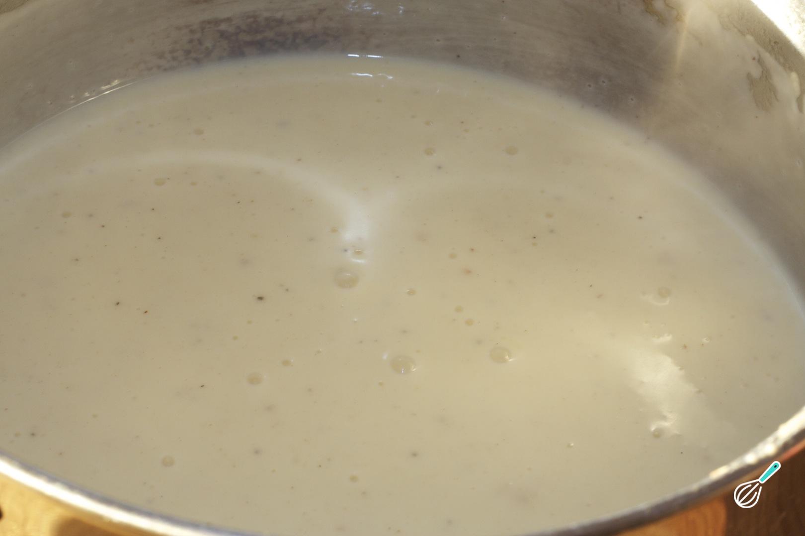 Quando o frango estiver cozinhado, retire e espere esfriar antes de desfiar. Enquanto isso, bata no liquidificador a cebola, o leite, a manteiga e a farinha, e leve ao fogo, mexendo sempre até engrossar um pouco - tal como um molho branco. Tempere a gosto com sal e pimenta.