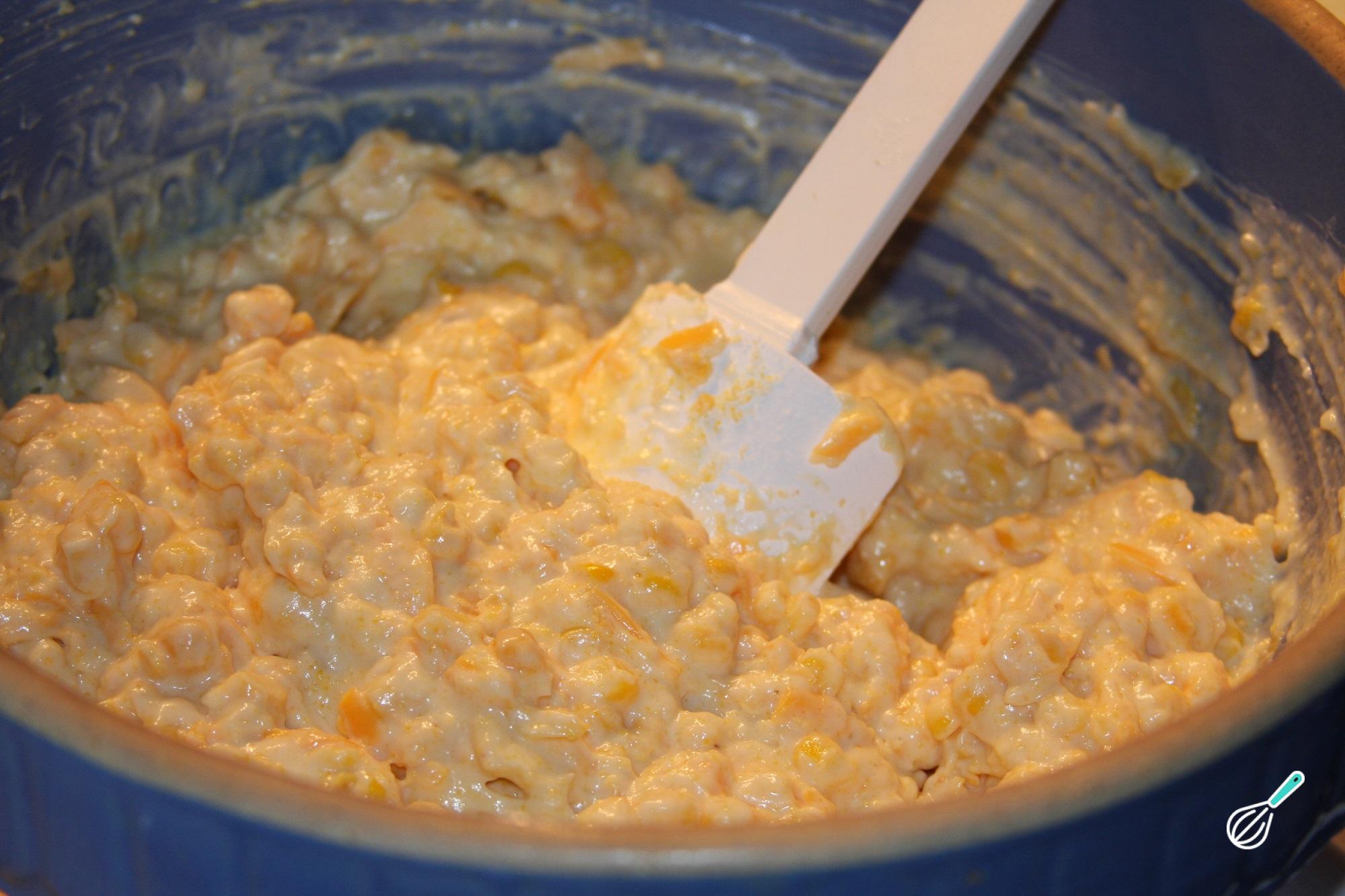 Misture o frango desfiado com a mostarda, o vinagre, o milho, o creme de leite e 1 xícara de água do cozimento. Retifique o sabor com sal e pimenta e transfira para uma assadeira untada.