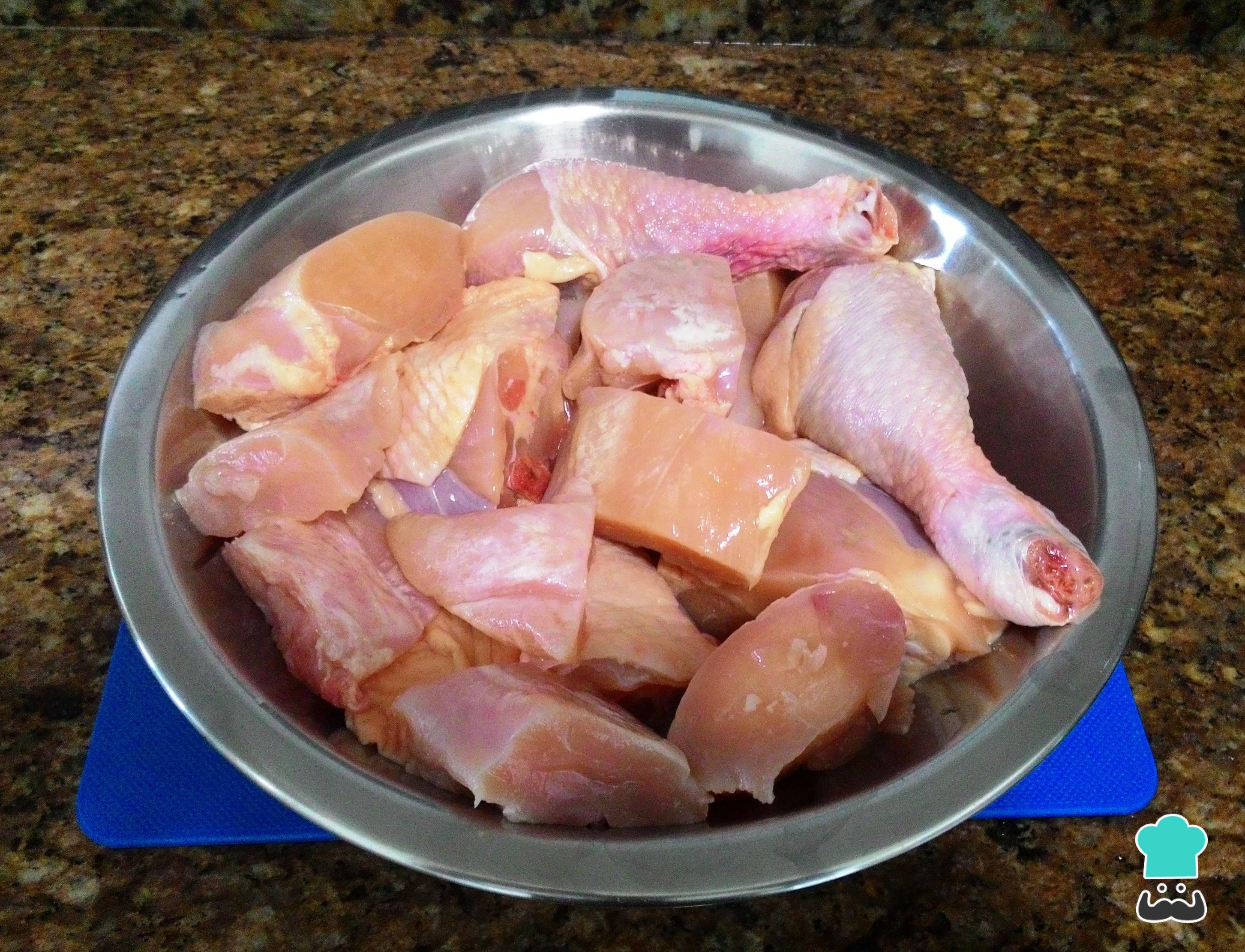 Comece a receita de galinhada cortando a galinha em pedaços e temperando-a com o suco do limão. Reserve durante 15 a 30 minutos.