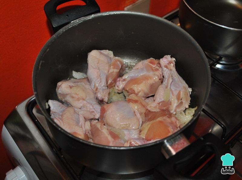 Em uma panela coloque o azeite e a galinha em pedaços, deixando dourar ligeiramente. Pique a cebola, o alho, o pimentão, os tomates e o cheiro verde e acrescente à panela, mexendo para refogar por igual.