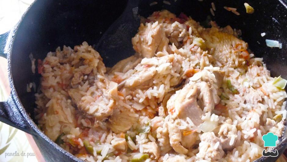 Passado uns minutos adicione o arroz, deixe-o fritar um pouco, e junte a água e os tabletes de caldo. Tempere com sal e cozinhe a galinhada em fogo brando, panela tampada.