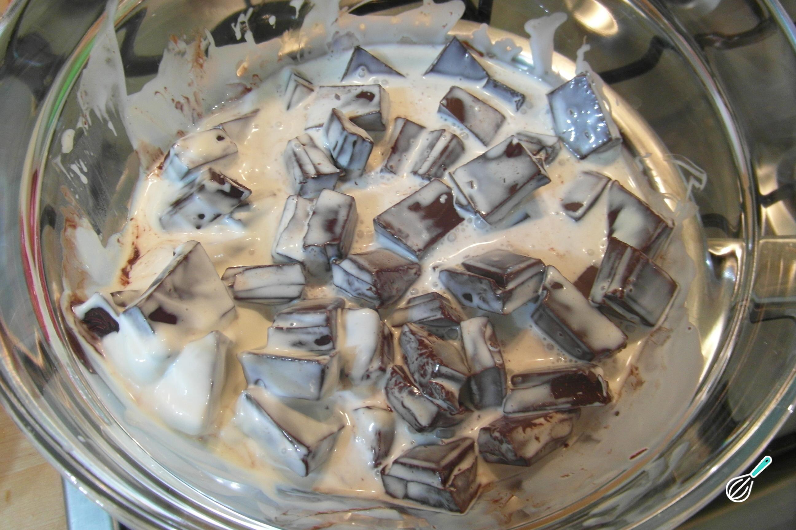 Coloque em um recipiente adequado para microondas e aqueça por cerca de 1 minuto no aparelho, garantindo que os ingredientes não fervem. Retire o ganache de chocolate do microondas e misture.