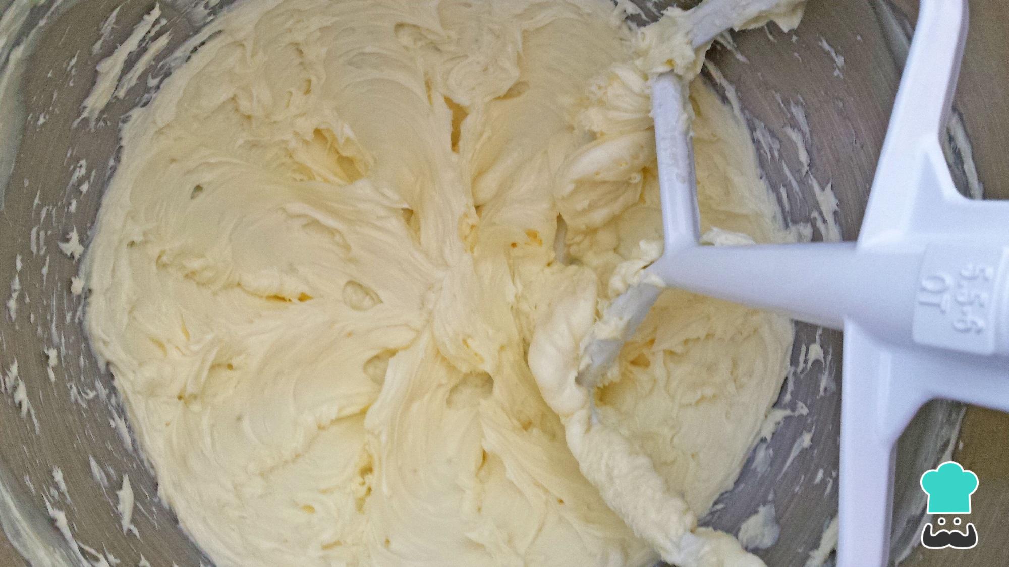 O passo seguinte desta cobertura de morangos é bater a manteiga com uma batedeira elétrica, até virar um creme macio.